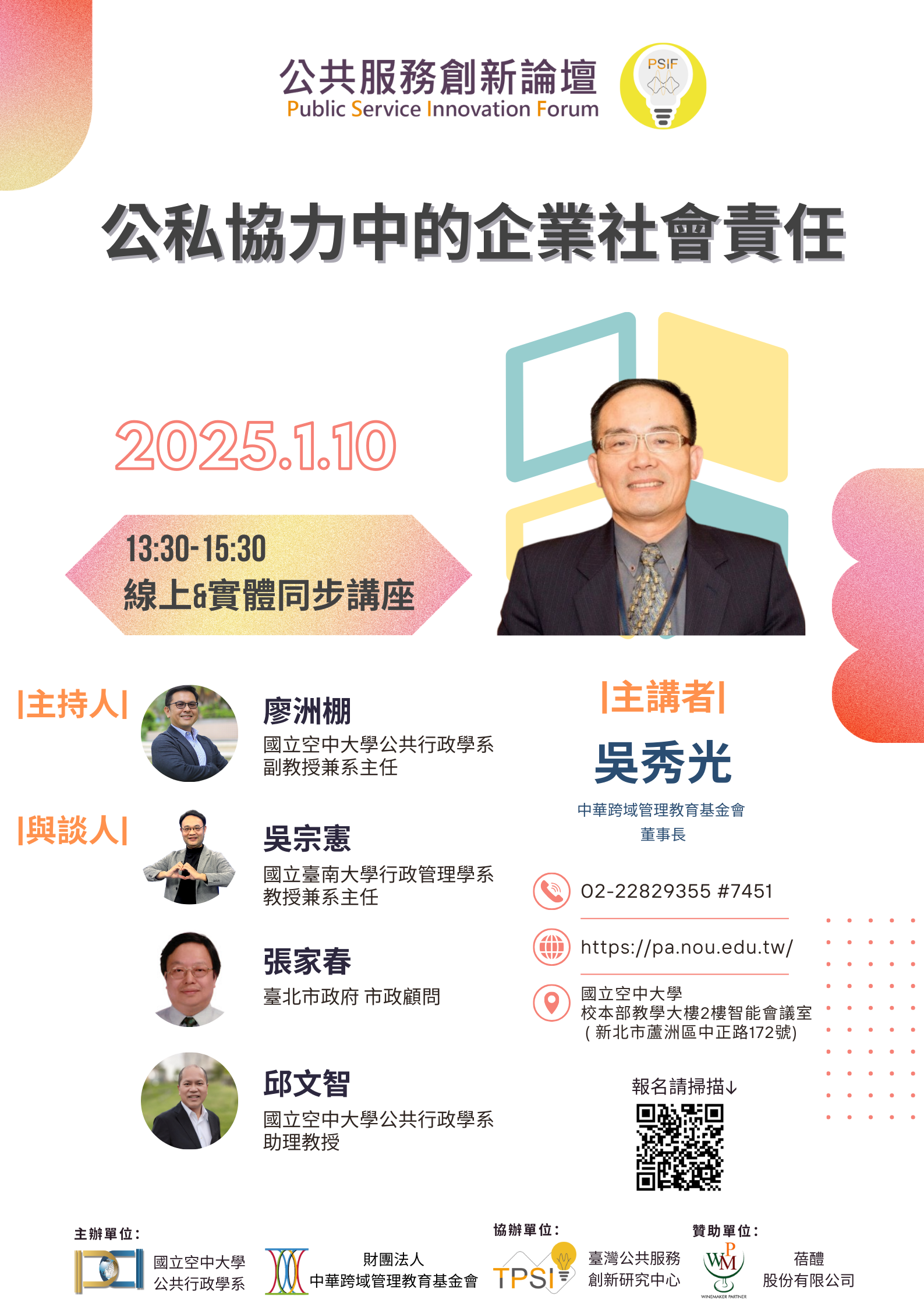 轉知 國立空中大學公共行政學系及臺灣公共服務創新研究中心於114年1月10日辦理公共服務創新論壇「公私協力中的企業社會責任」演講活動,敬邀各校同仁及學生踴躍報名參加