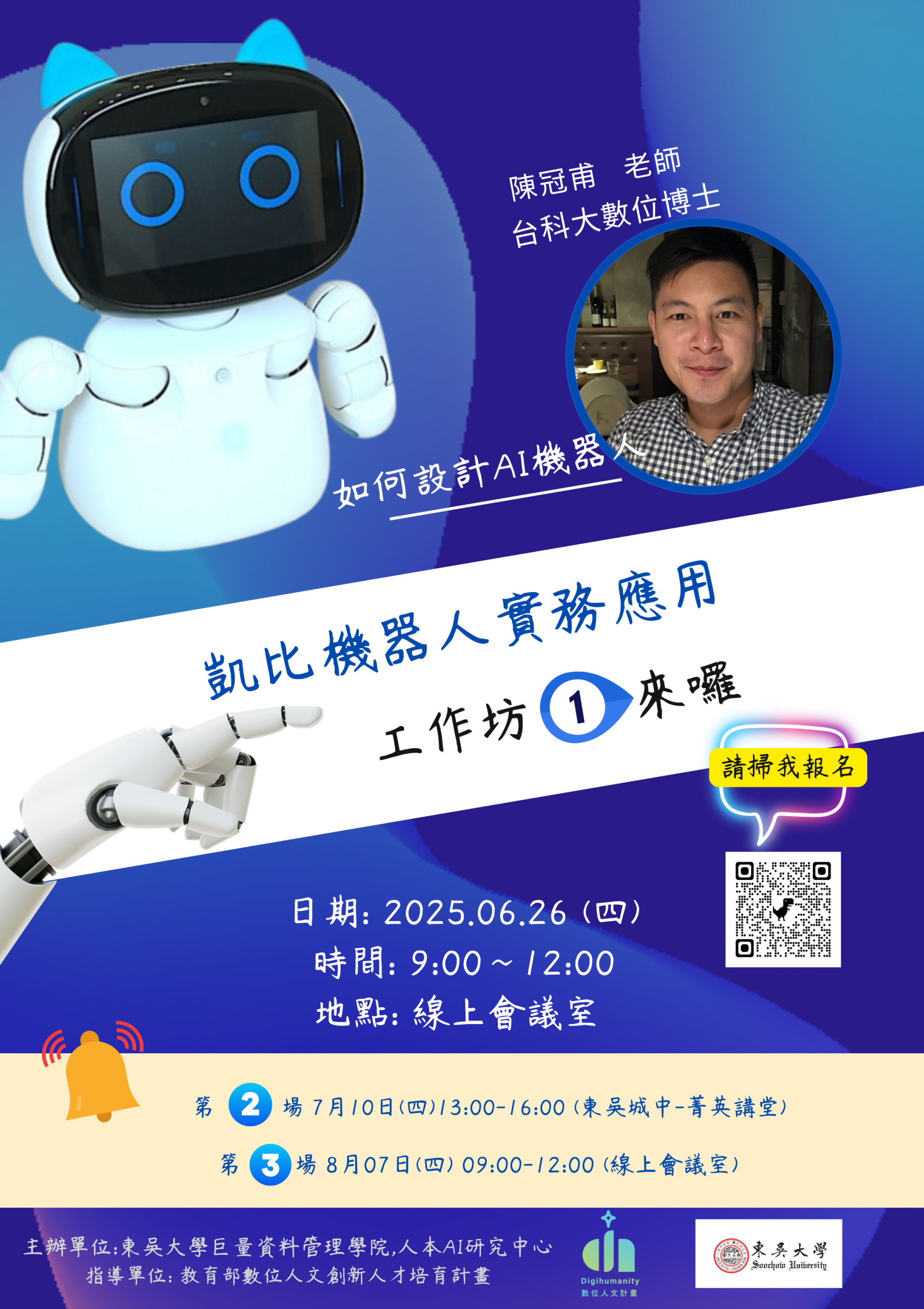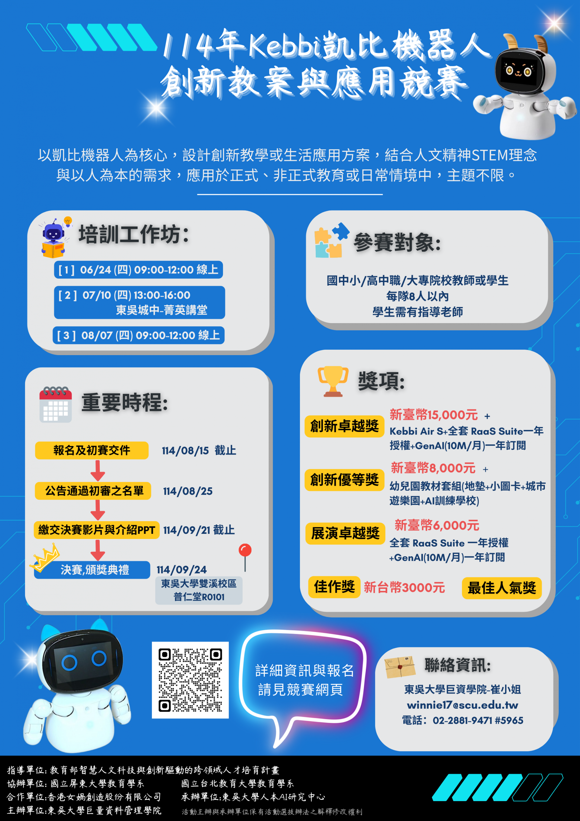 公告 活動公告 檢送國立臺北教育大學與東吳大學共同辦理「STEM人文跨域與AI應用競賽—114年Kebbi凱比機器人創新教案與應用競賽」競賽辦法1份,請協助轉知並鼓勵貴校師生踴躍報名參加。