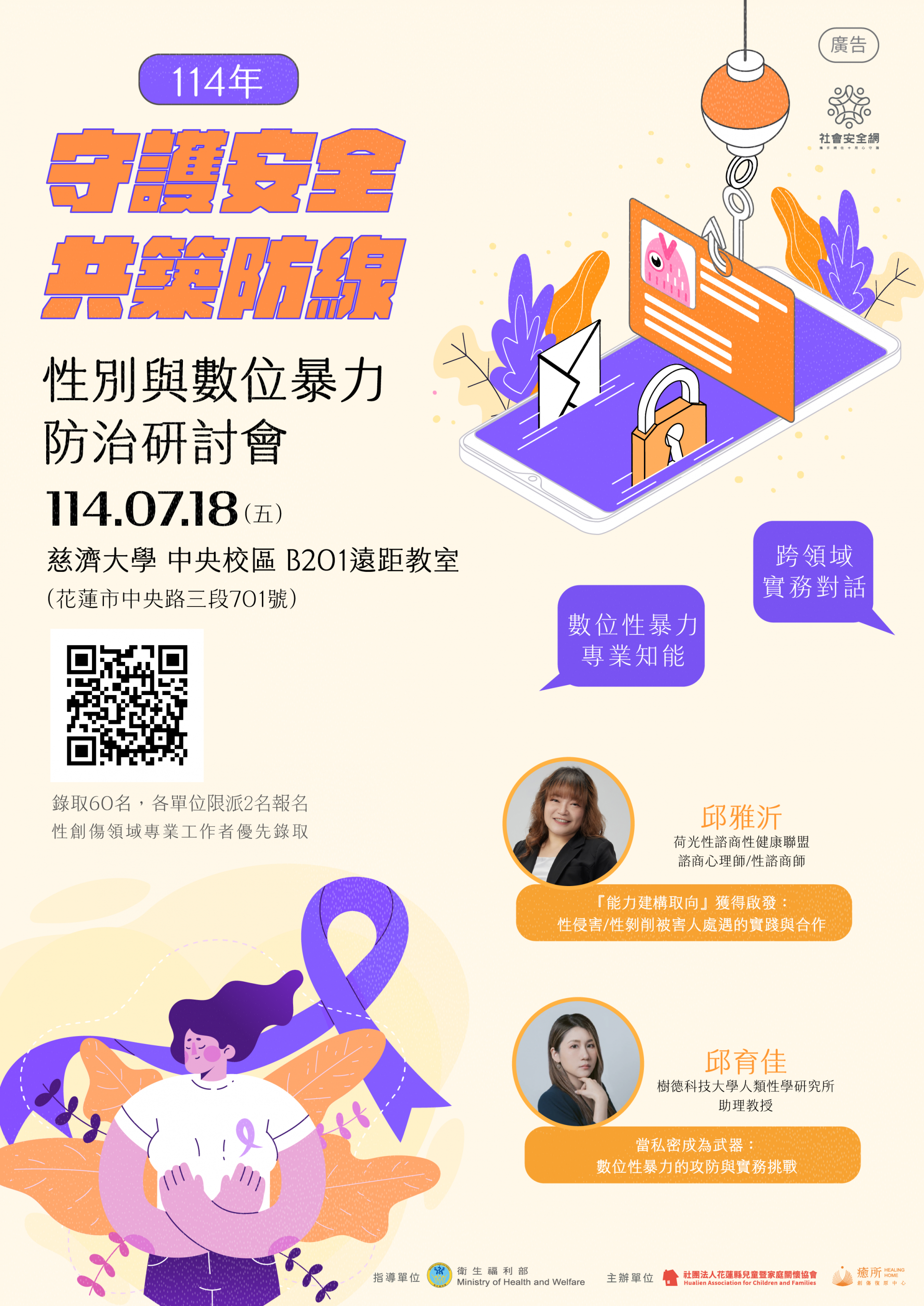 轉知社團法人花蓮縣兒童暨家庭關懷協會辦理「114年守護安全,共築防線--性別與數位暴力防治研討會」