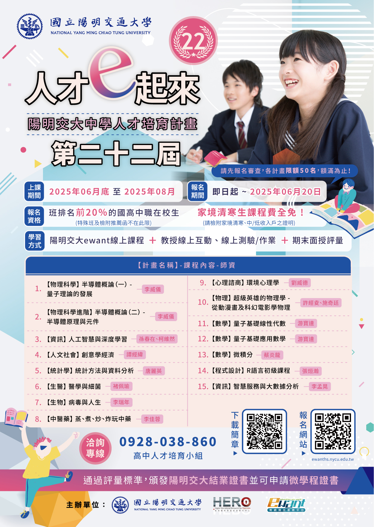計畫內容:第二十二期開課計畫包含(一) 物理科學人才培育計畫、(二) 物理科學進階人才培育計畫、(三) 資訊人才培育計畫、(四) 統計學人才培育計畫、(五) 數學人才培育計畫、(六) 人文社會人才培育計畫、(七) 心理諮商人才培育計畫、(八) 中醫藥人才培育計畫、(九) 生物人才培育計畫、(十) 生醫人才培育計畫、(十一) 程式設計人才培育計畫、(十二)物理人才培育計畫。可參考附件報名簡章各科開課說明,請詳閱計畫網站 https://ewanths.nycu.edu.tw 各計畫課程說明。 |
