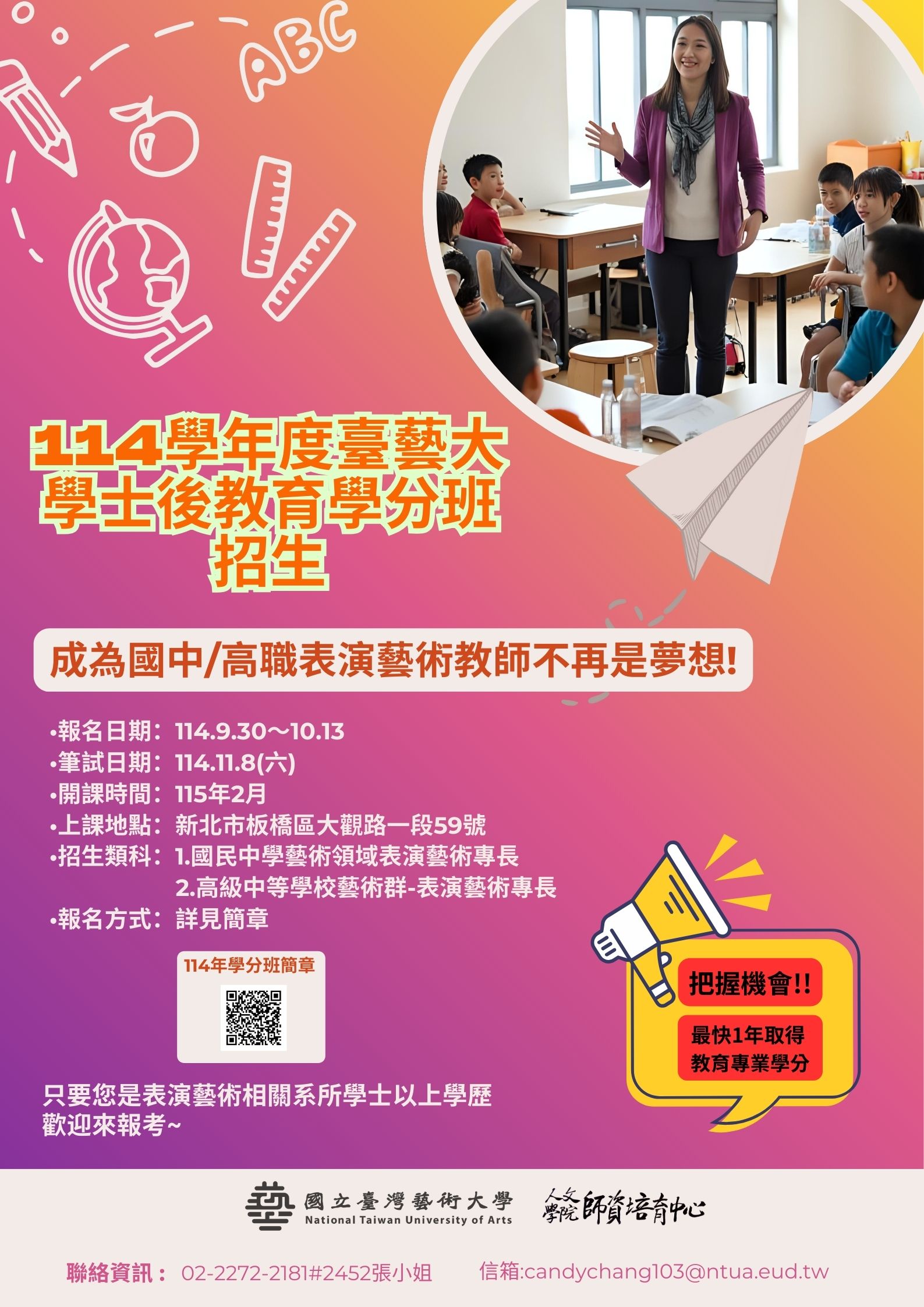一、依據國立臺灣藝術大學 114 年 9 月 24 日臺藝大程字第 1141005425 號函辦理。 二、詳見附件,如有報名相關問題,請逕洽該校聯絡人:張佳芬,電話: 02-2272-2181 分機 2452