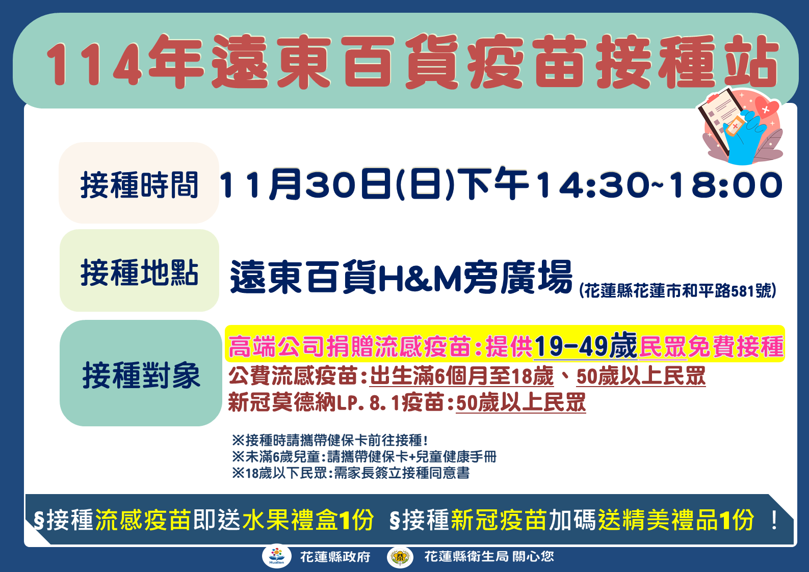 - 另花蓮市衛生所將於本年 11 月 30 日(日)下午 14:30-18:00 ,於花蓮遠東百貨 H&M 旁廣場,辦理 6 個月以上全年齡流感疫苗接種活動,請貴園(中心)協助轉知並鼓勵家長及幼兒踴躍前往接種,以提升社區整體防護力。