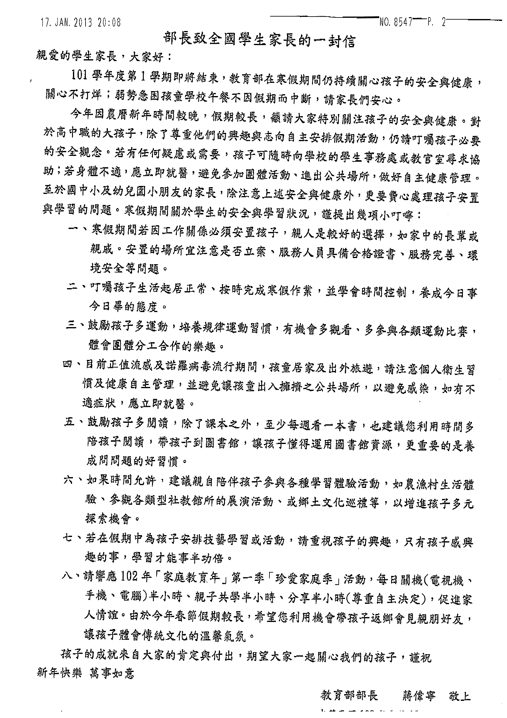 「部長給全國學生家長的一封信」如附件,請各校自行下載並轉發給學生家長。