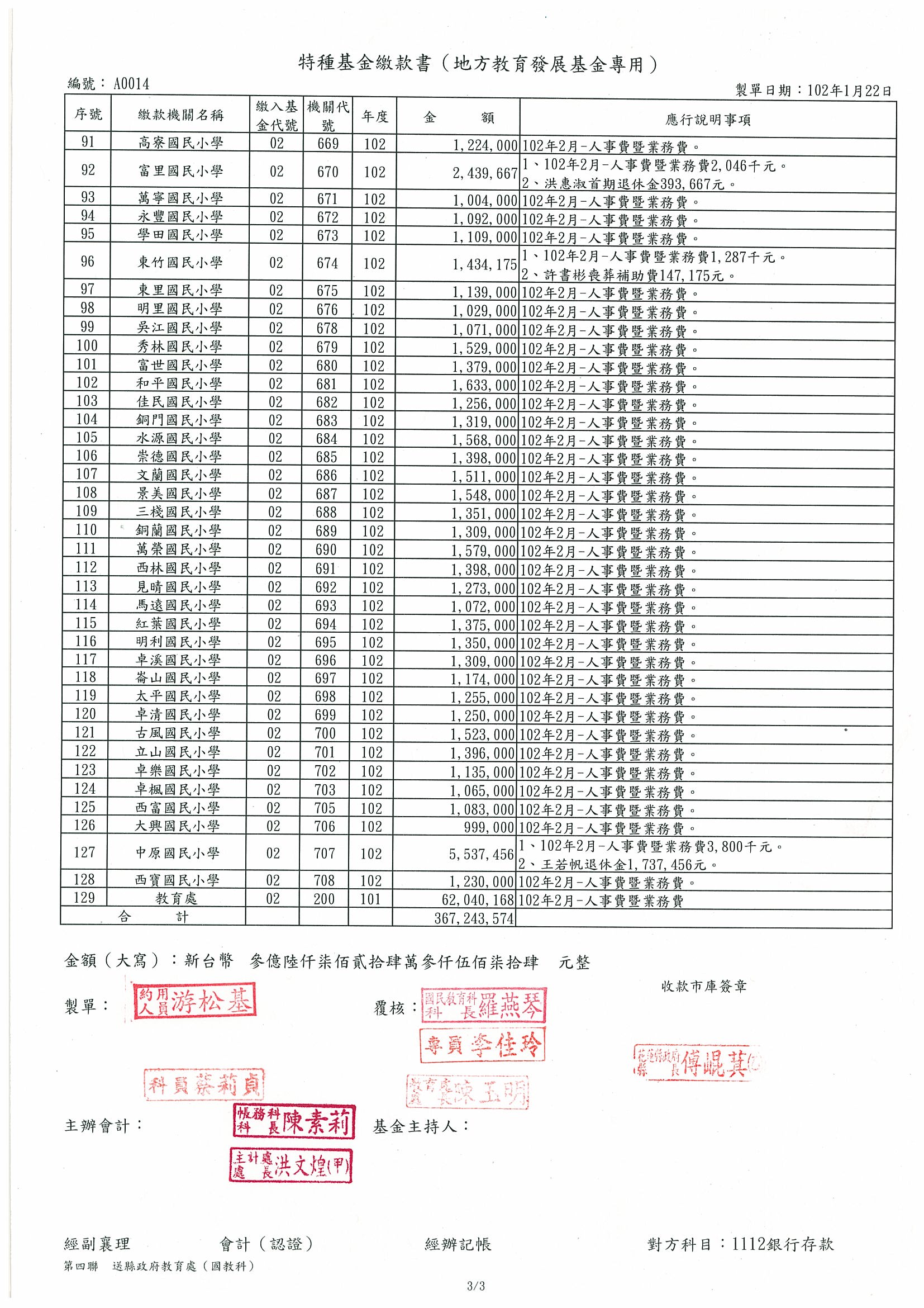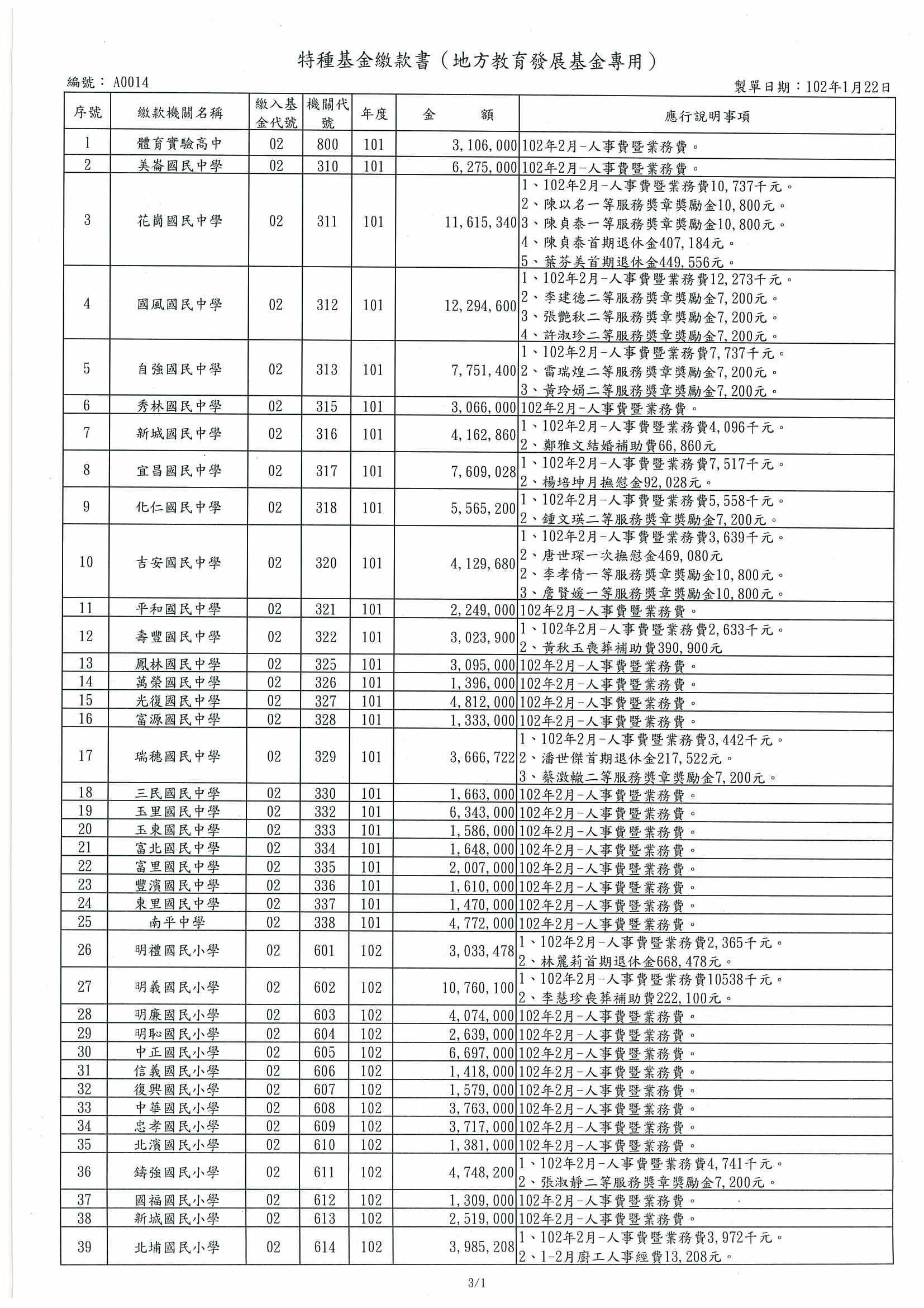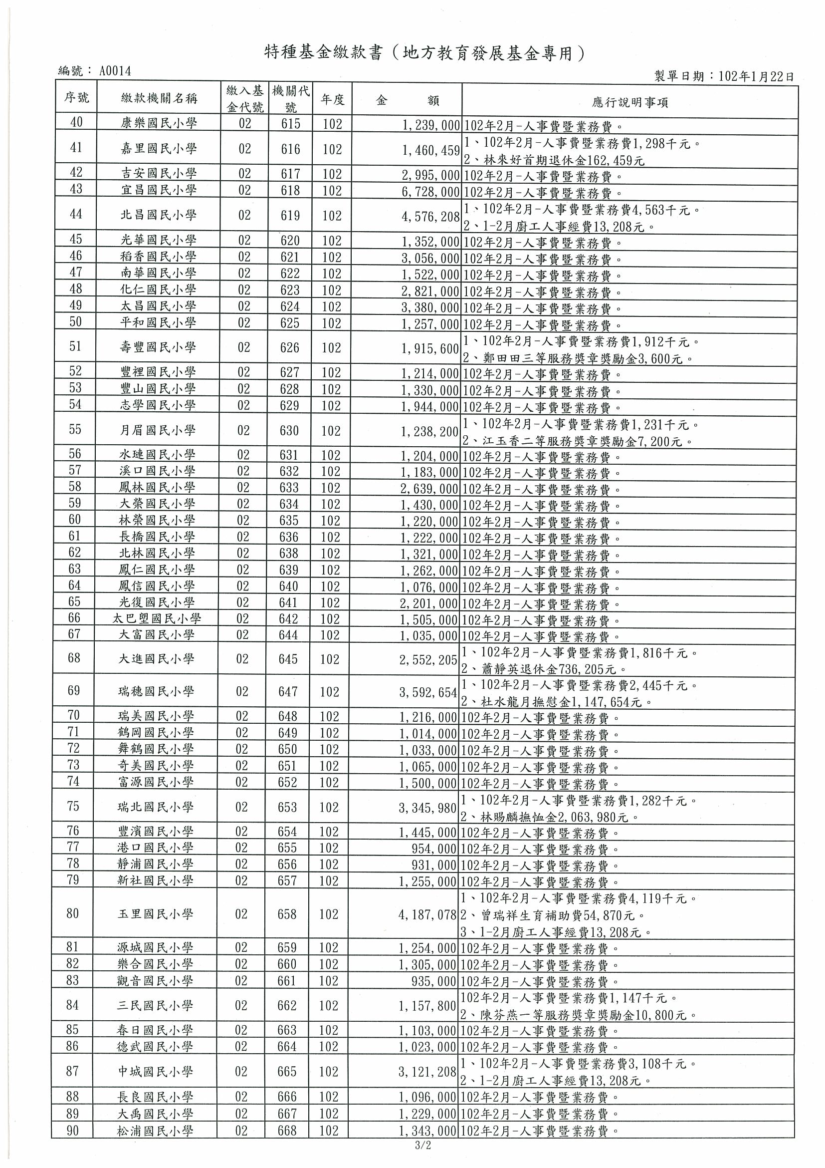 有關 102 年度地方教育發展基金成立附屬單位預算擬由公務預算每月撥補人事費、業務費至本處及本府所屬學校之基金專戶乙案, 102 年 2 月份之人事費暨業務費撥補數如附檔。