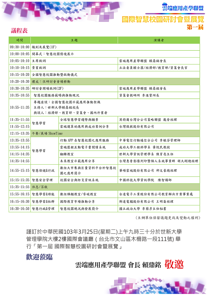 世新大學協助經濟部工業局舉辦「第一屆國際智慧校園研討會暨展覽」活動,歡迎縣內教師及相關人員踴躍報名參加。