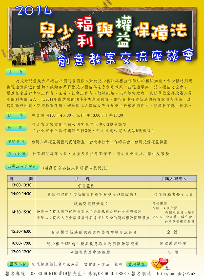 【轉知交流座談會】轉知社團法人台灣少年權益與福利促進聯盟舉辦『兒童及少年福利與權益保障法』創意教案交流會,請鼓勵相關人員踴躍報名參加。