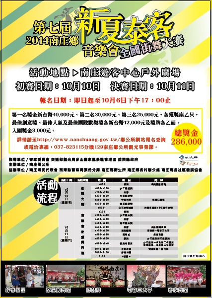 二、苗栗縣南庄鄉公所訂於本(103 年)10 月 10 日至 11 日假南庄遊客中心戶外廣場辦理「第七屆新夏泰客音樂會」全國街舞大賽。