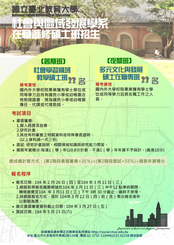 國立臺北教育大學社會與區域發展學系104學年度夜間多元文化與發展碩士班在職專班及暑期社會學習領域教學碩士班招生,歡迎國小及幼稚園合格教師踴躍報考進修。