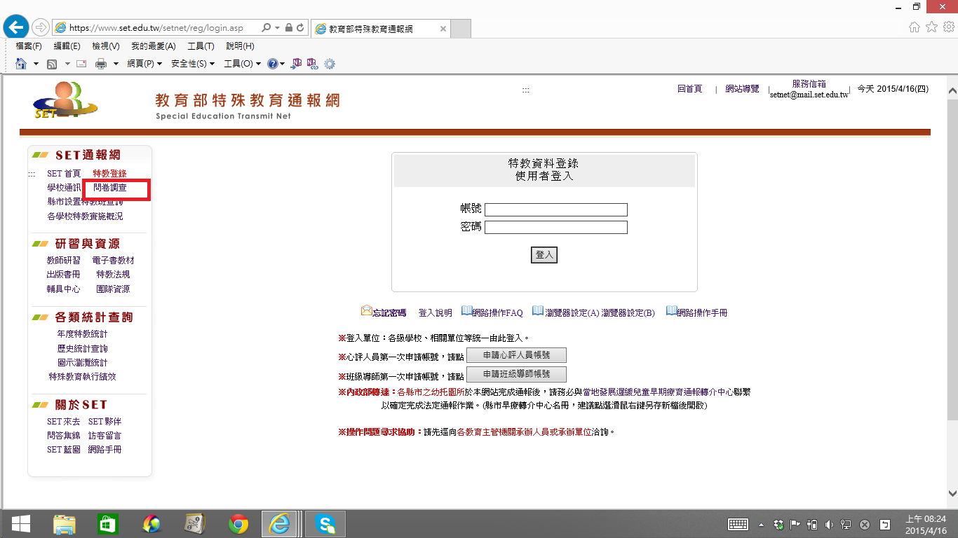 (特教通報網公告)請全縣學前、國小、國中、高中職(含特殊學校)特教業務承辦老師到教育部特教通報網填寫問卷調查