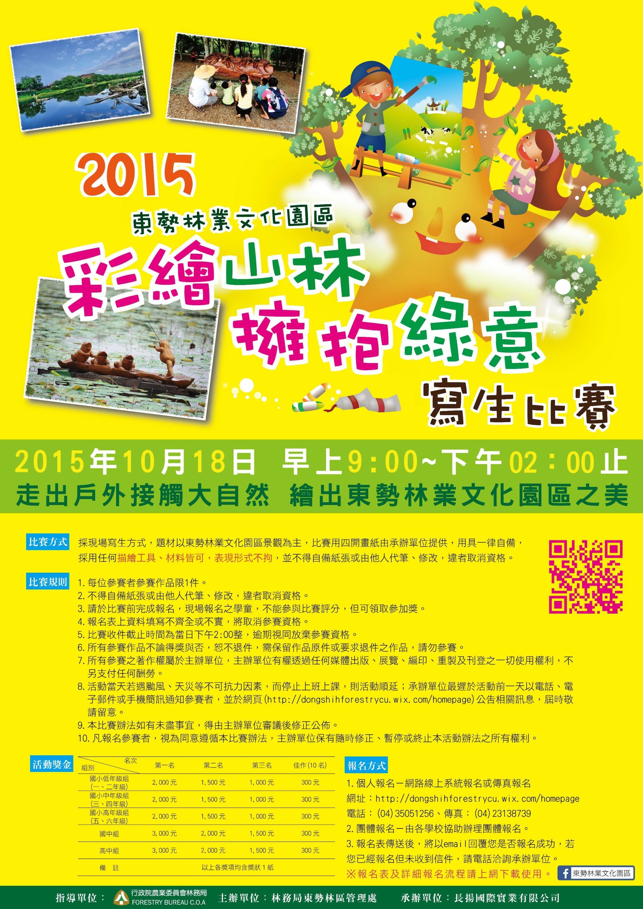 檢送行政院農業委員會林務局東勢林區管理處東勢林業文化園區「彩繪山林、擁抱綠意」寫生比賽活動簡章、宣傳海報電子檔各1份,請鼓勵貴校學生踴躍參加,請查照。