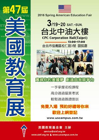 二、 2016 年春季 AIEF 美國教育展訂於 105 年 3 月 19 日至 3 月 20 日於台北中油大樓正式展出。由美國各學校代表親自來台解說各校進修課程、學位、校園文化與環境,與申請流程,提供台灣的學生對國外高等教育的瞭解、及出國深造的選擇。提供大眾一個完整正確的留美資訊和服務平台。