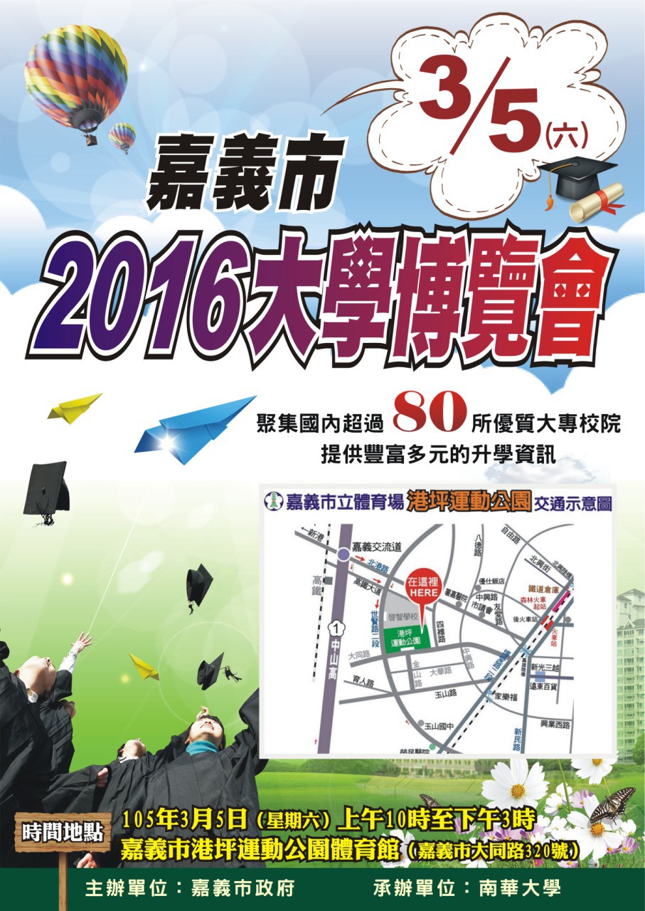轉知嘉義市政府辦理「2016大學博覽會」宣傳海報1份,請各校鼓勵學生及家長踴躍參加,請查照。