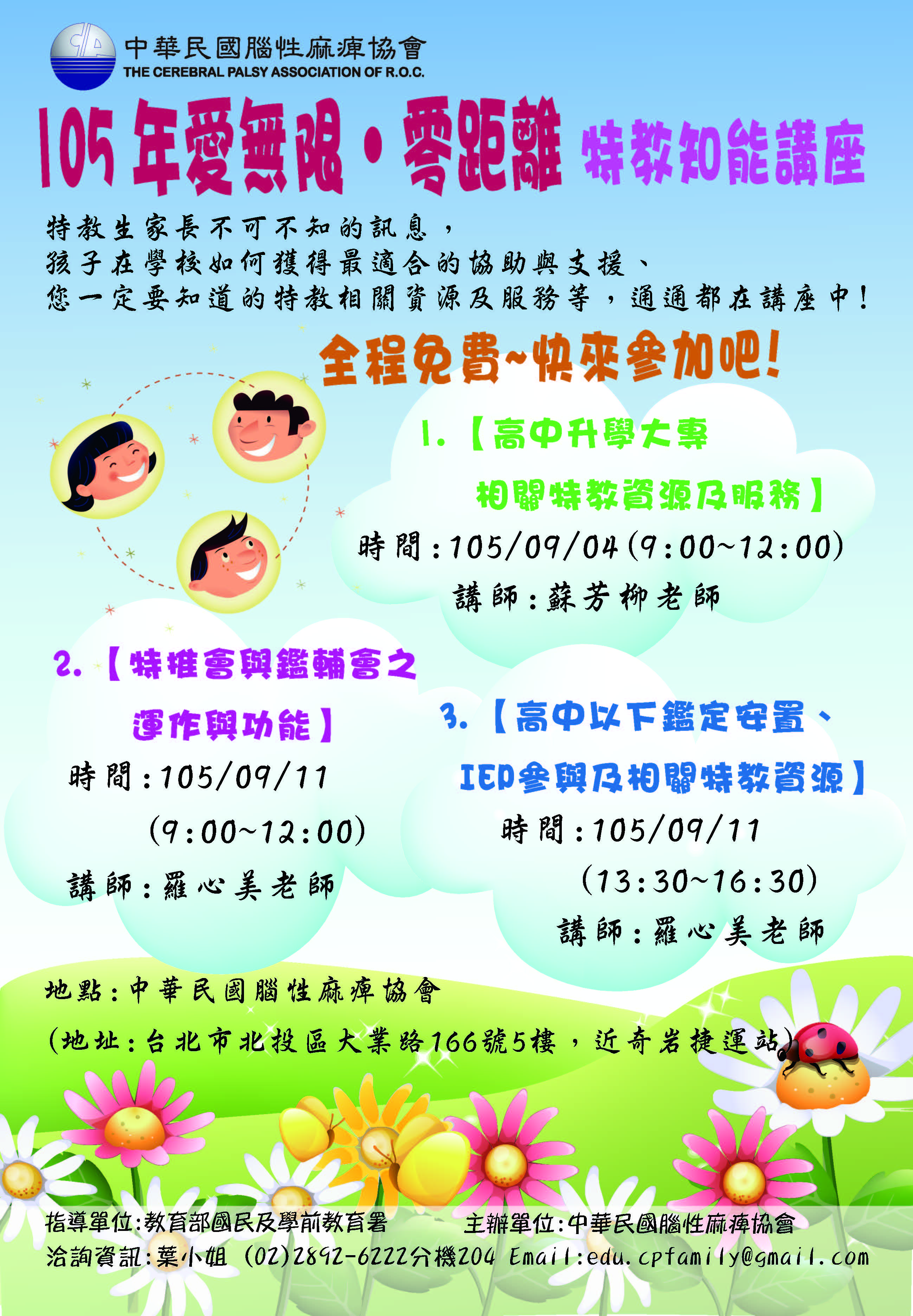 【轉知】中華民國腦性麻痺協會於本(105)年9月4日與9月11日辦理「105年度愛無限‧零距離特教知能講座」,即日起報名至9月2日截止,請查照。