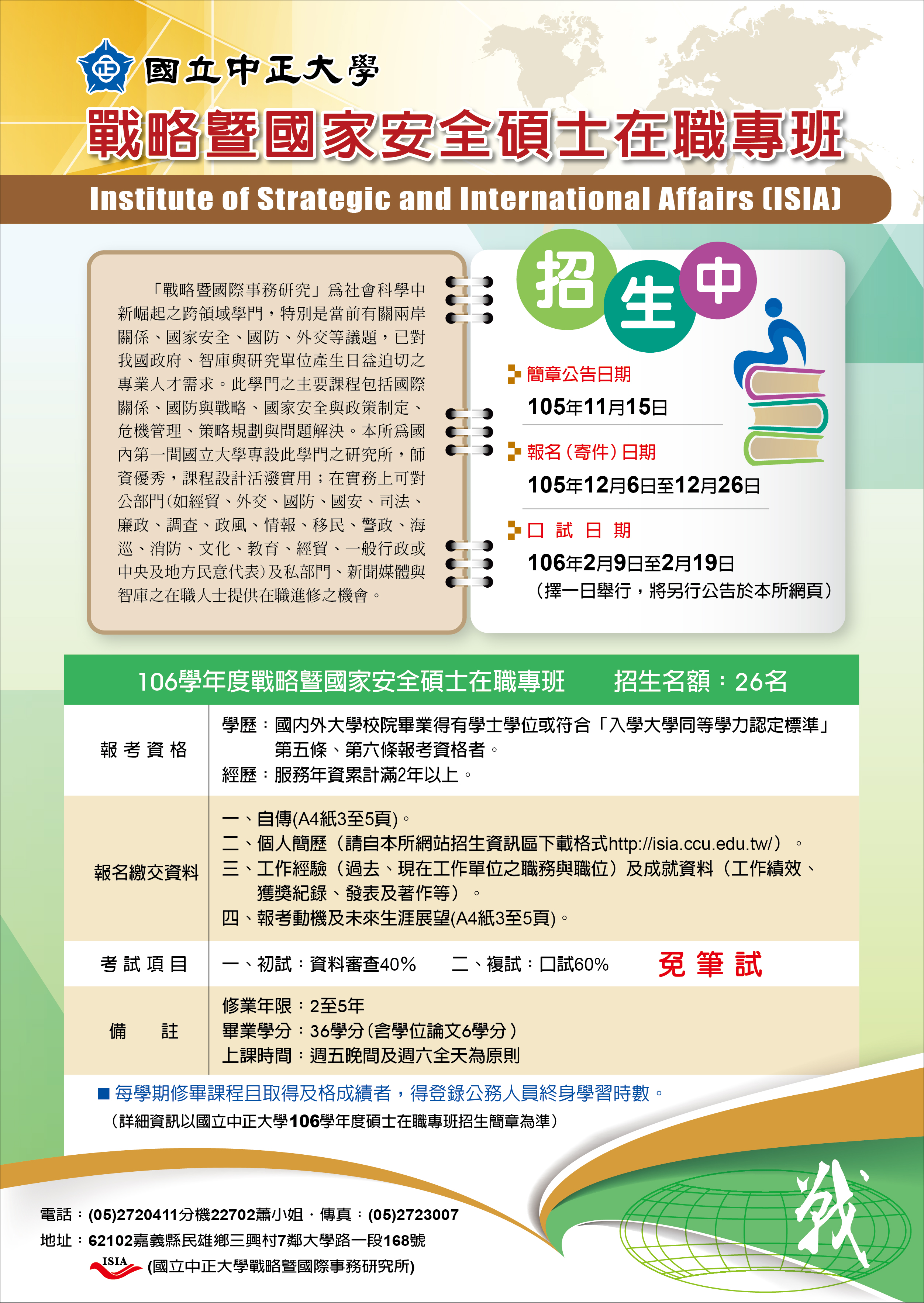 檢送國立中正大學戰略暨國際事務研究所106學年度「戰略暨國家安全碩士在職專班」招生資訊,歡迎有興建人士踴躍報考,請查照。
