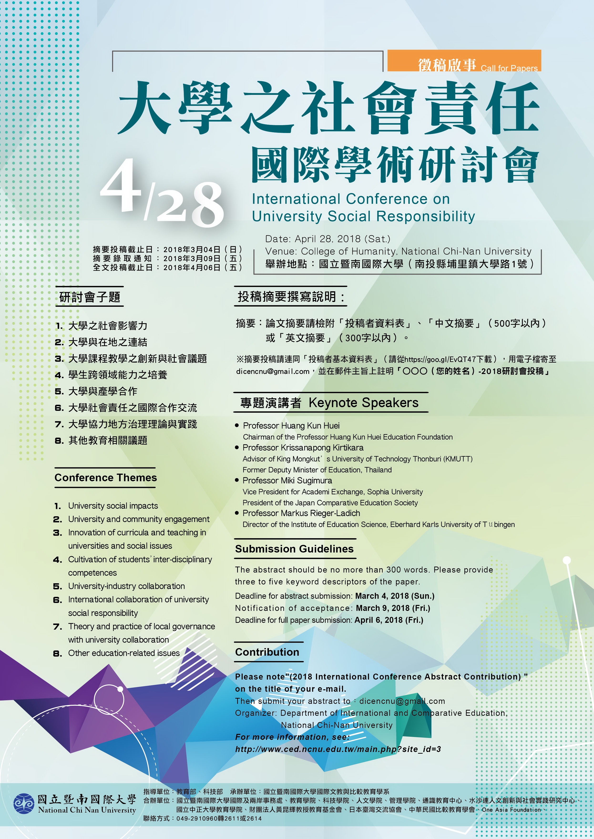 檢送國立暨南國際大學國際文教與比較教育學系辦理「大學之社會責任」國際學術研討會徵稿啟事如附,請轉知貴屬教師踴躍投稿,請查照。