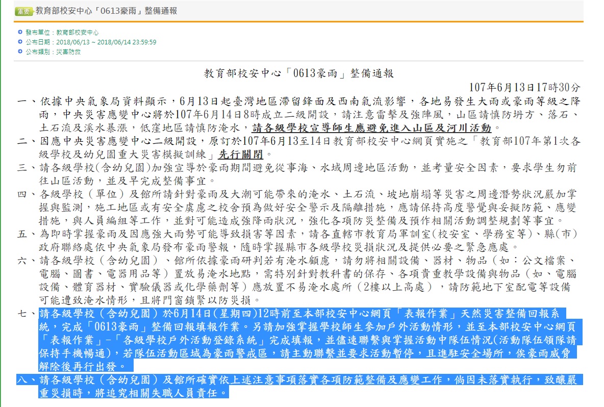 一、請各級學校(含幼兒園)於 6 月 14 日(星期四)12 時前至教育部校安中心網頁「表報作業」天然災害整備回報系統,完成「0613 豪雨」整備回報填報作業。另請加強掌握學校師生參加戶外活動情形,並至教育部校安中心網頁「表報作業」-「各級學校戶外活動登錄系統」完成填報,並儘速聯繫與掌握活動中隊伍情況(活動隊伍領隊請保持手機暢通),若隊伍活動區域為豪雨警戒區,請主動聯繫並要求活動暫停,且進駐安全場所,俟豪雨威脅解除後再行出發。