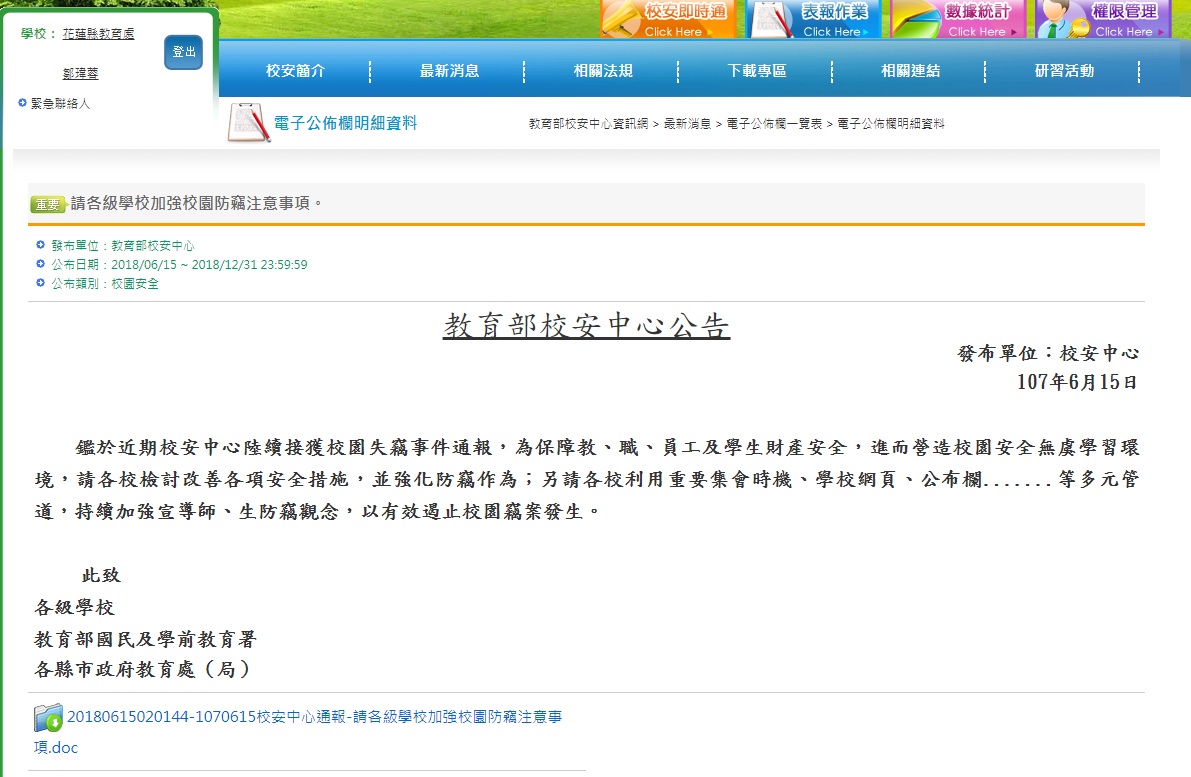 【公告】校安中心公布一則最新公告,提醒各校記得進入校安中心點閱「請各級學校加強校園防竊注意事項」