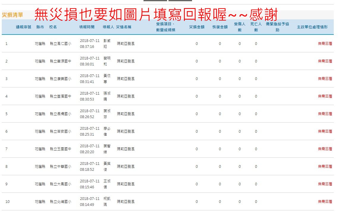 今日請各位主任巡視校園後,回報校安中心貴校有無災損,無災損也要回報喔感謝大家!