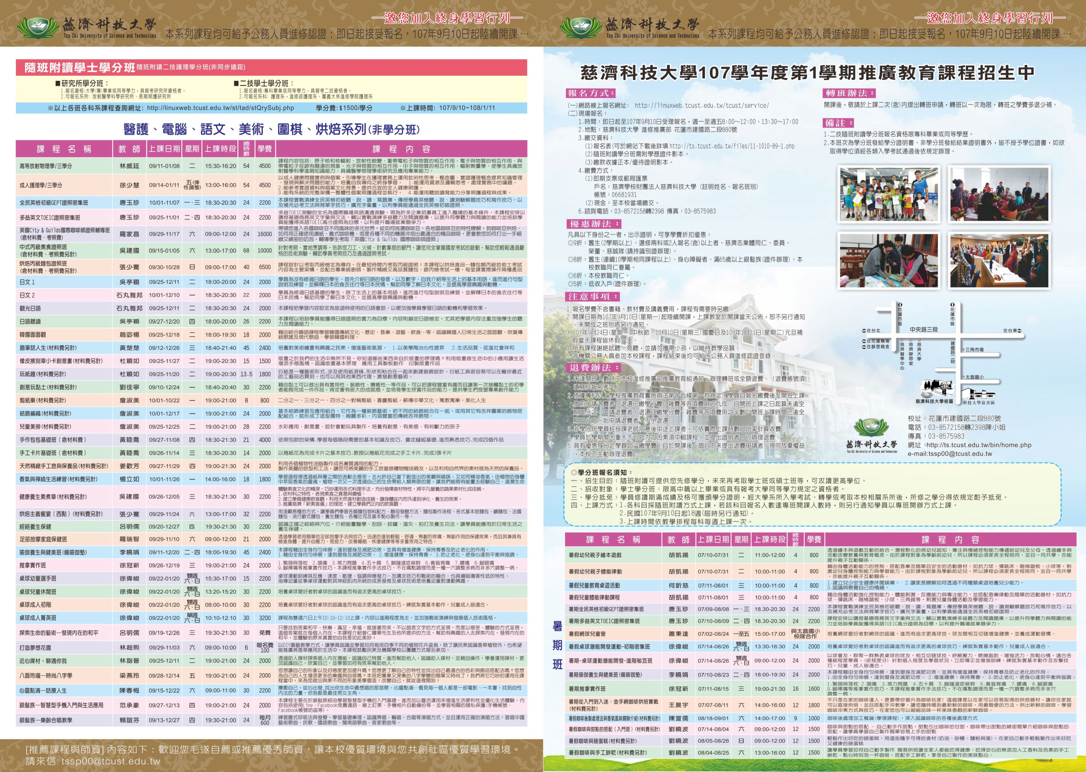 轉知 慈濟學校財團法人慈濟科技大學107學年度第1學期推廣教育招生資訊,請踴躍報名。