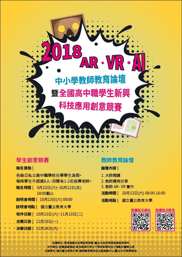 【轉知】檢送教育部國民及學前教育署「2018 AR、VR、AI中小學教師教育論壇暨全國高中職學生新興科技應用創意競賽計畫」、「2018全國新興科技AR、VR應用創意競賽報名簡章」以及活動海報各乙份,請貴校踴躍報名,請查照。