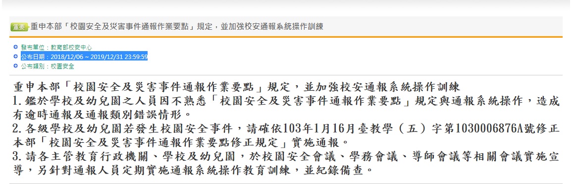 重申本部「校園安全及災害事件通報作業要點」規定,並加強校安通報系統操作訓練