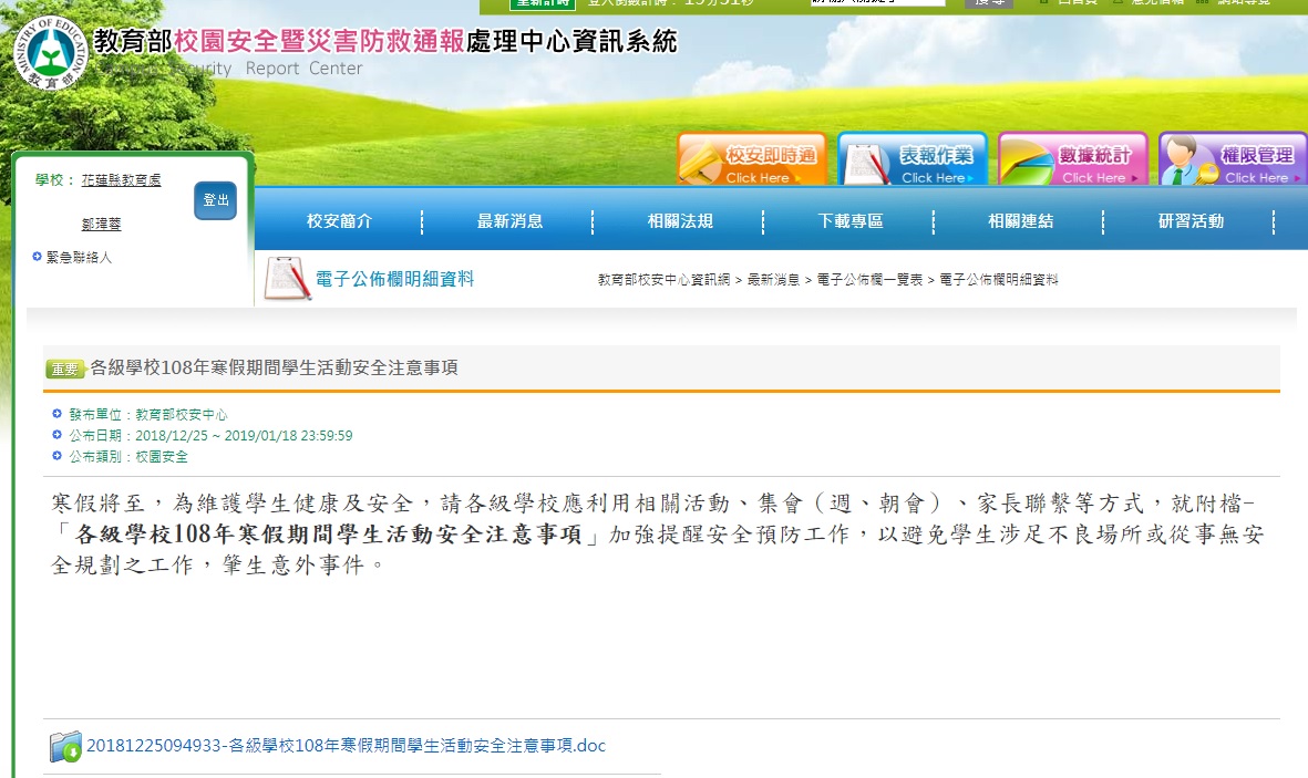 【公告】教育部校安中心公告各級學校108年寒假期間學生活動安全注意事項,請各校承辦人員點閱公告並依規定說明。