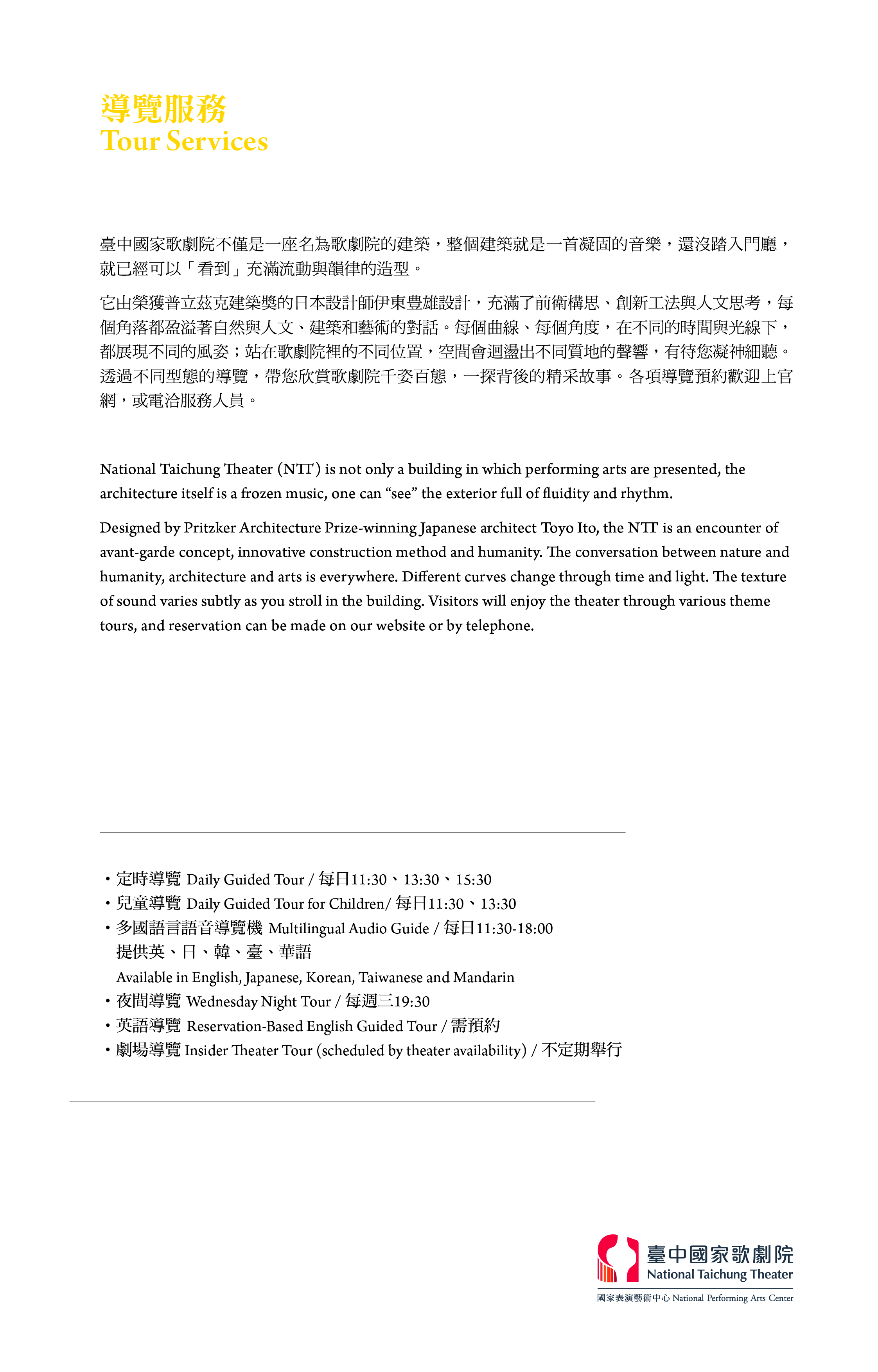 【導覽服務】臺中國家歌劇院定期導覽服務與108年度劇場導覽簡介,歡迎踴躍參與。
