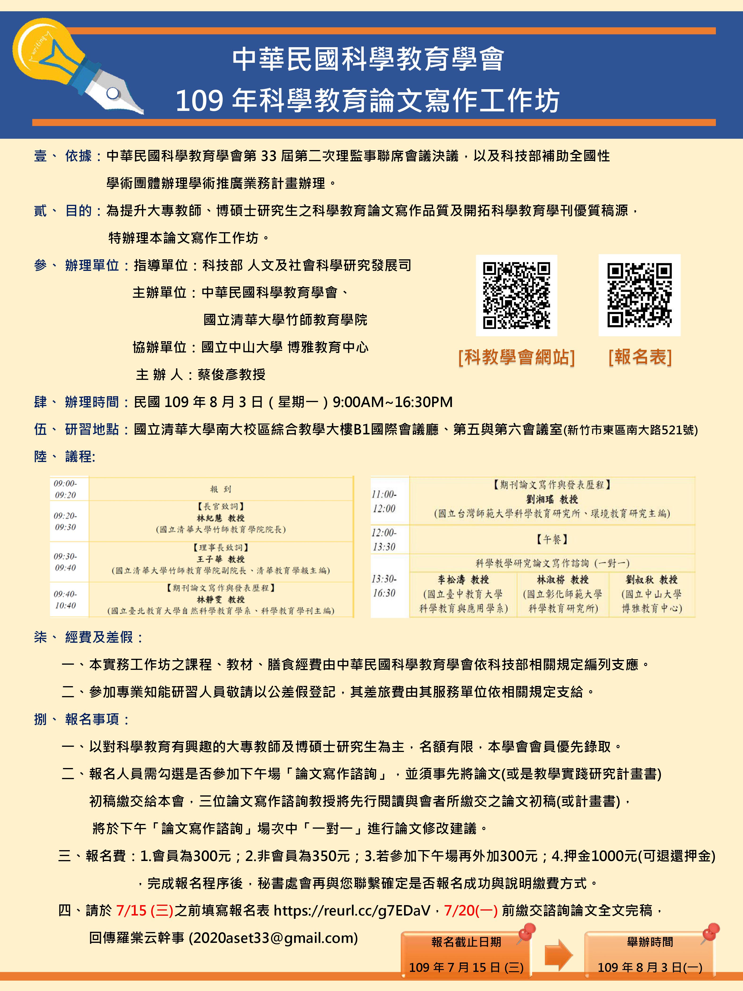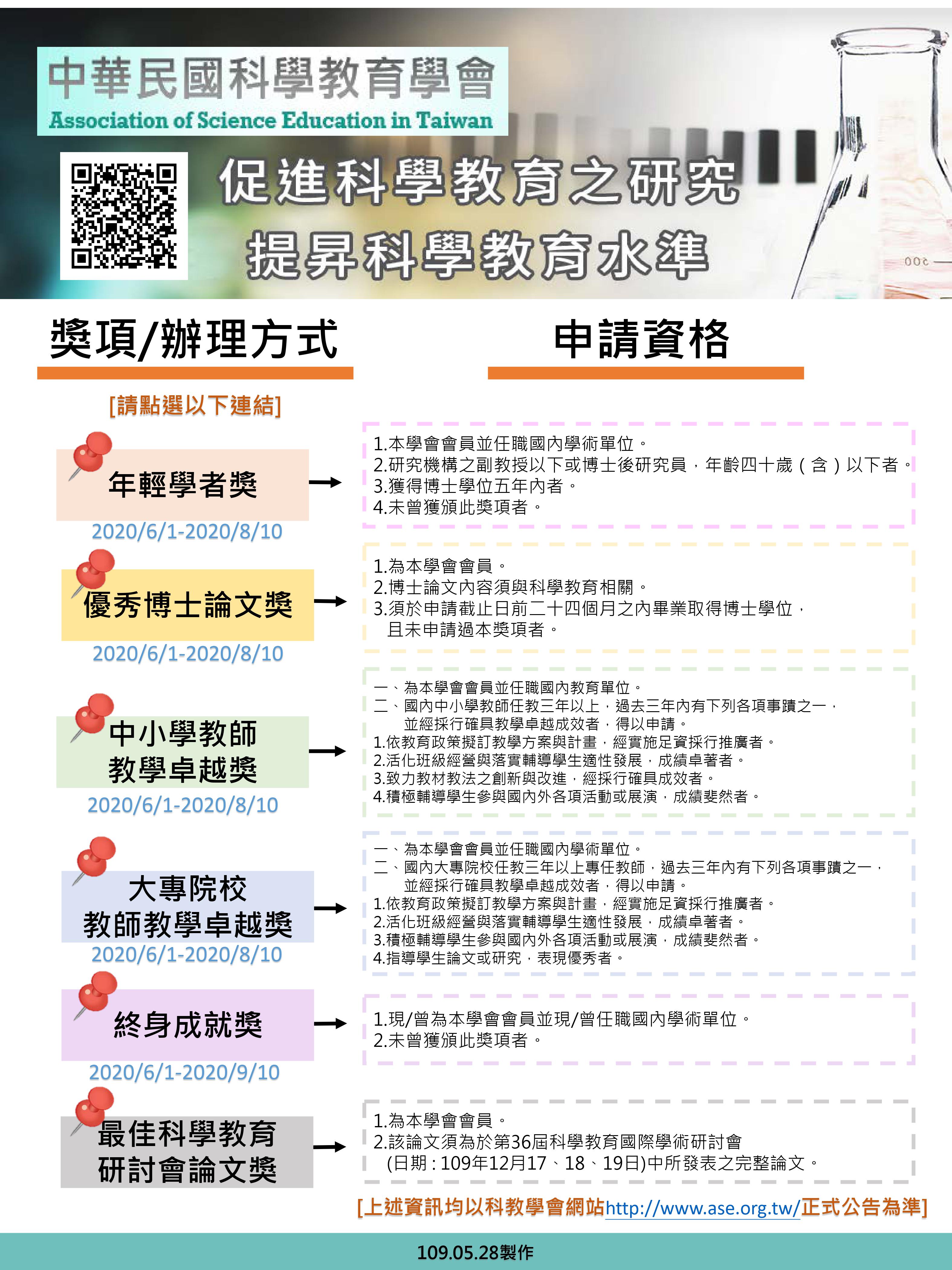 檢送中華民國科學教育學會為促進科學教育之研究與提升科學教育水,辦理多項獎項甄選,邀請貴校符合條件者提出申請.另科教會執行科技部補助109年度學術期刊與學術推廣活動計畫將舉辦科學教育論文寫作工作坊,請查照.