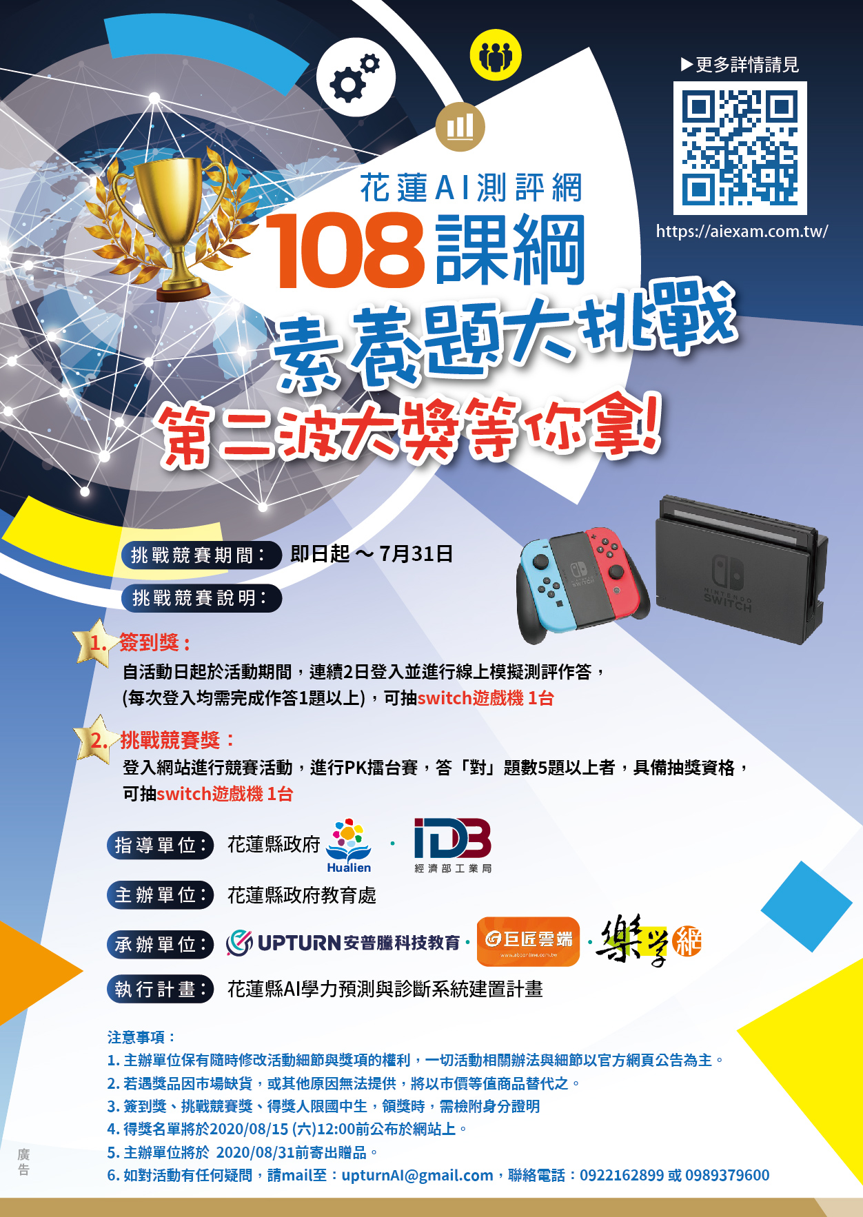 【轉知】檢送本府辦理「花蓮AI測評網 108課綱素養題大挑戰」第二波大獎等你拿活動企劃書與海報各一份,請鼓勵所屬踴躍參加拿大獎,請查照。