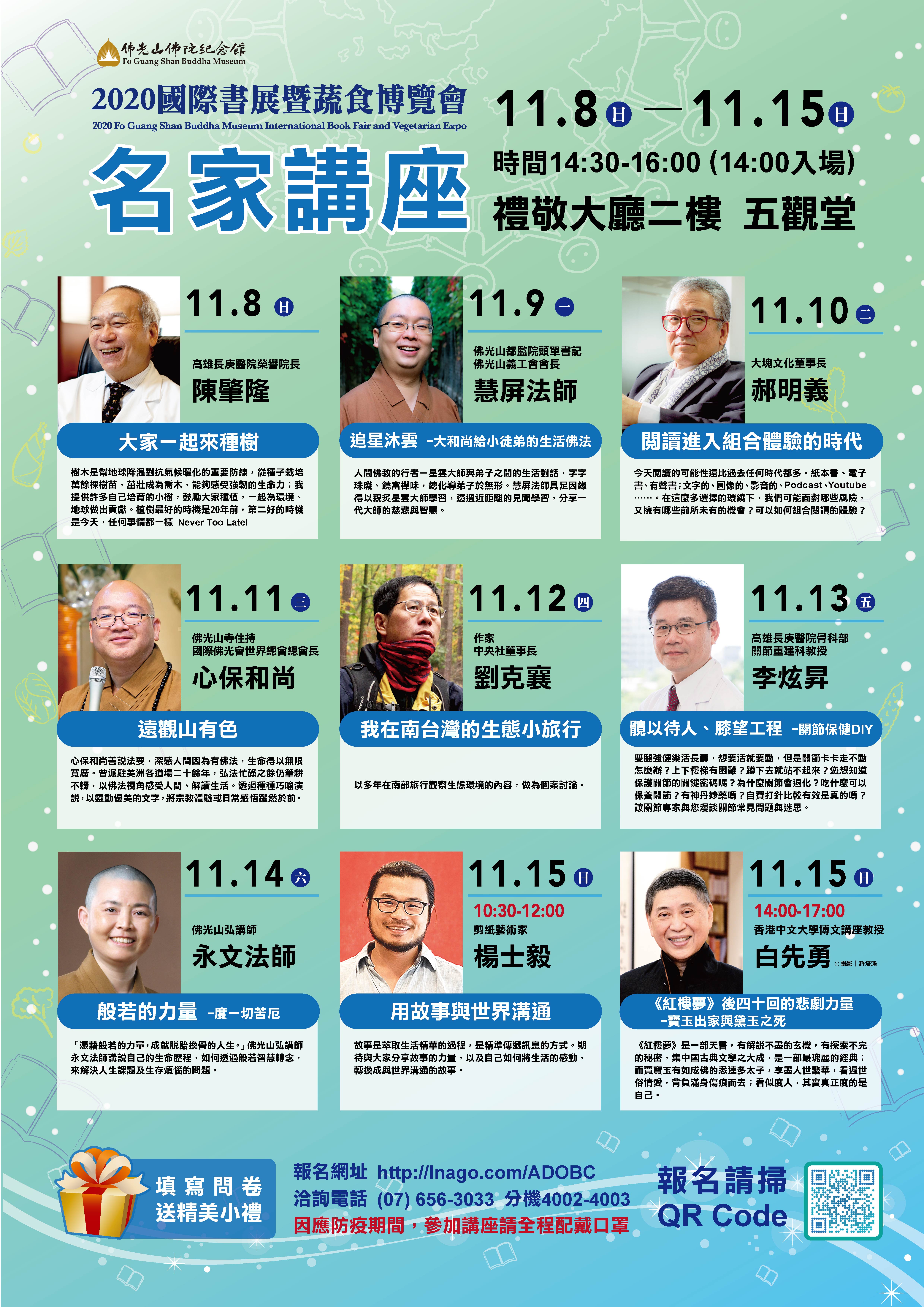 一、辦理日期: 109 年 11 月 08 日至 11 月 15 日,於佛光山佛陀紀念館舉辦 9 場名家講座。