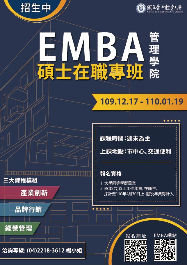 轉知 國立臺中教育大學管理學院國際經營管理碩士在職專班(EMBA)110學年度碩士在職專班訊息