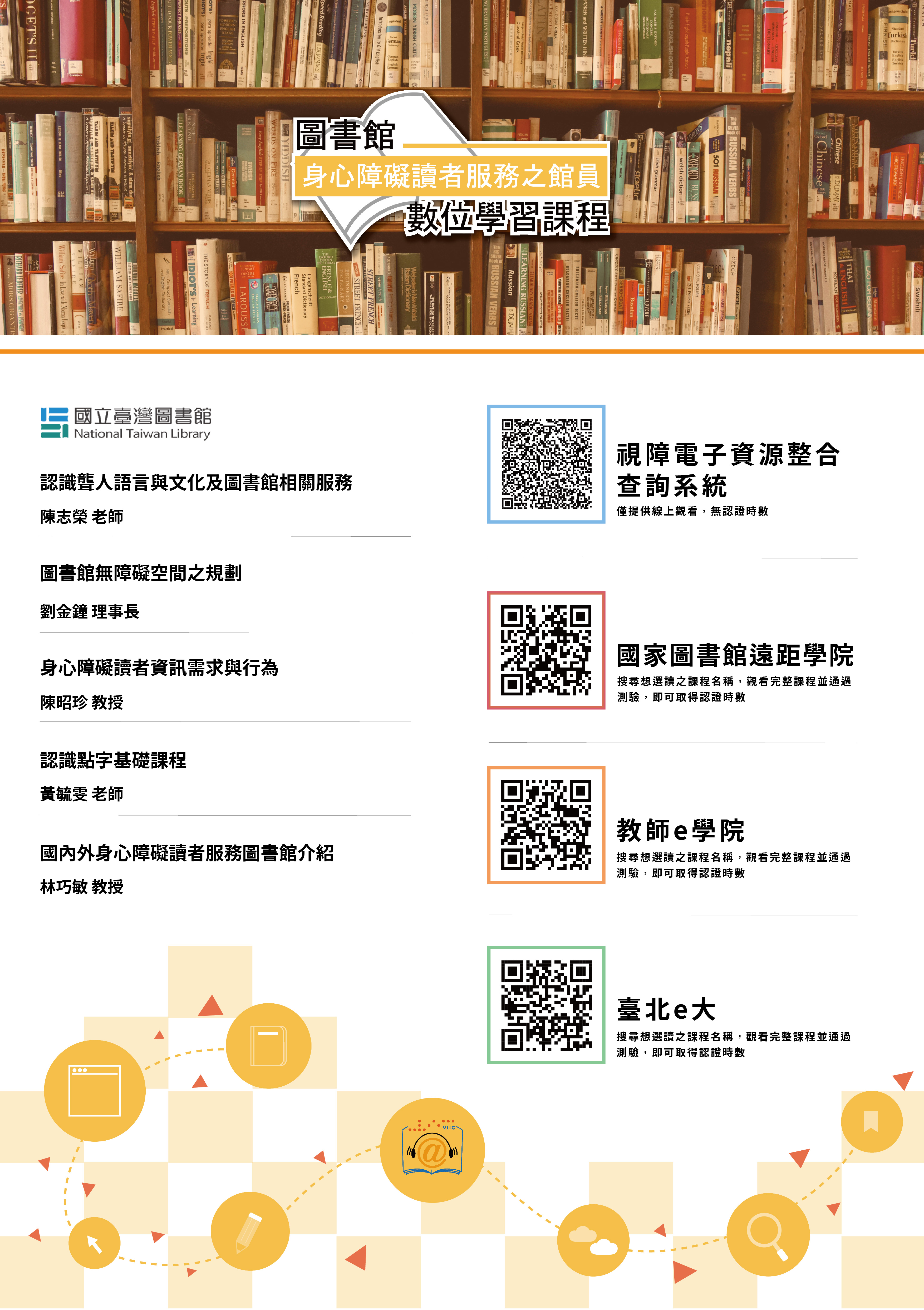 【轉知】國立臺灣圖書館推廣「圖書館身心障礙讀者服務之館員數位學習課程」,請查照。