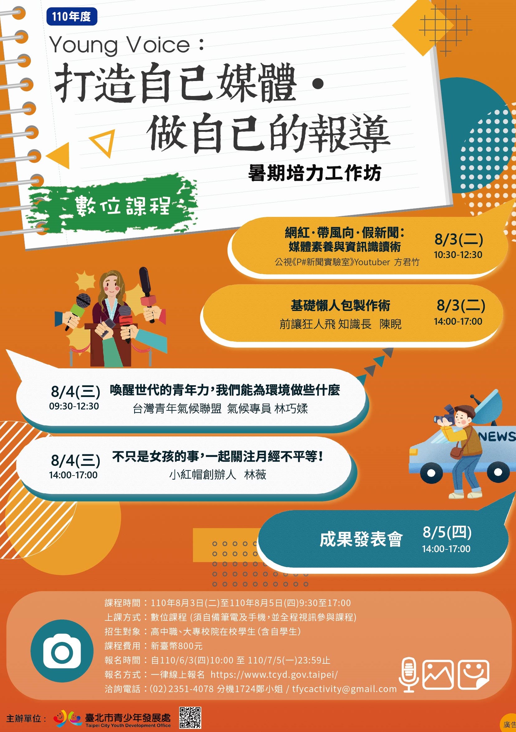 轉知臺北市青少年發展處辦理110年度「Young Voice:打造自己媒體‧做自己的報導」暑期培力工作坊(數位課程),請鼓勵學生踴躍參加,請查照。