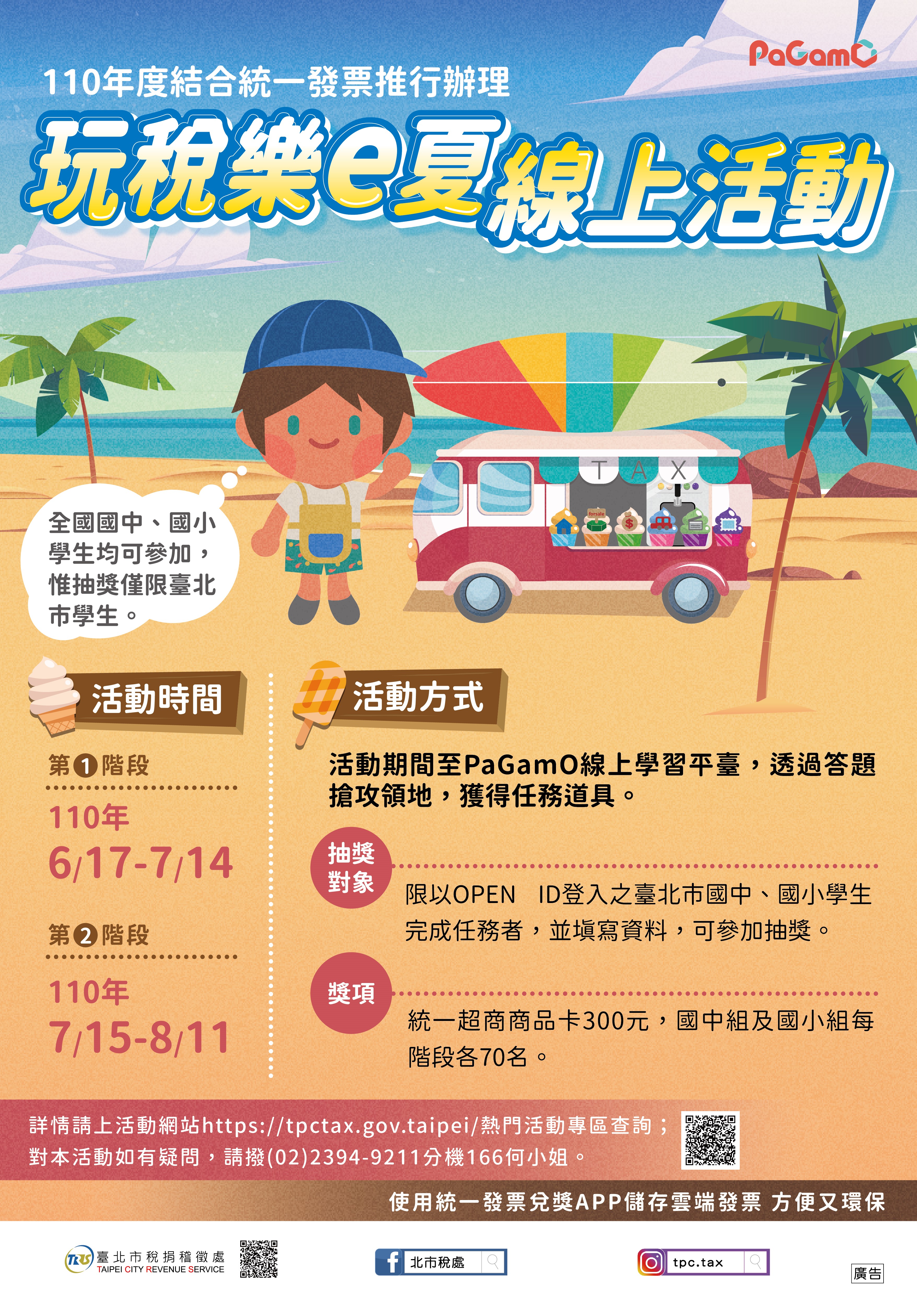 【轉知】臺北市稅捐稽徵處為提高國中、國小學生對租稅學習的興趣,與PaGamO線上學習平臺合作舉辦「玩稅樂e夏線上活動」,請鼓勵所屬踴躍參與,請查照。