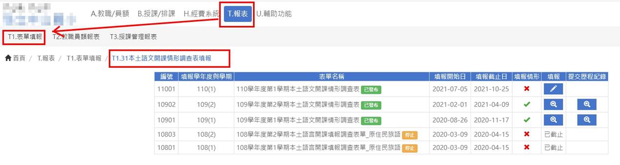 三、 110 學年度第 1 學期本土語文開課情形調查表,於 7/15 正式開放填報,請學校於填報期間內至【T1.31 本土語文開課情形調查表】填寫編號 11001 之調查表。