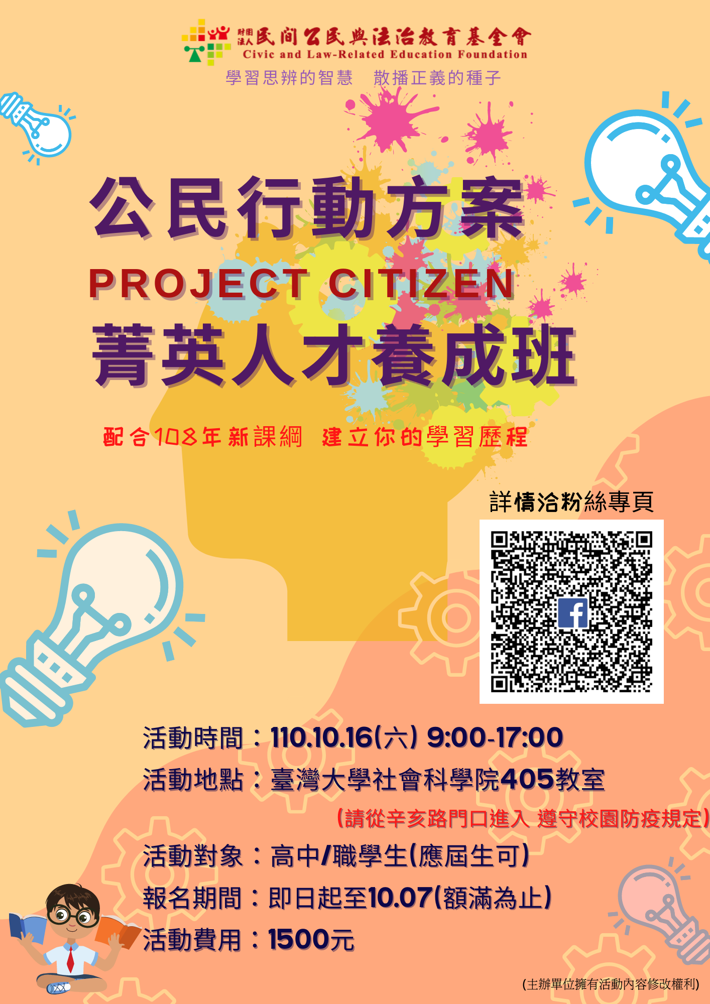 【轉知】財團法人民間公民與法治教育基金會辦理110年「公民行動方案Project Citizen菁英人才養成班」,敬邀 各高中/職同學報名參加
