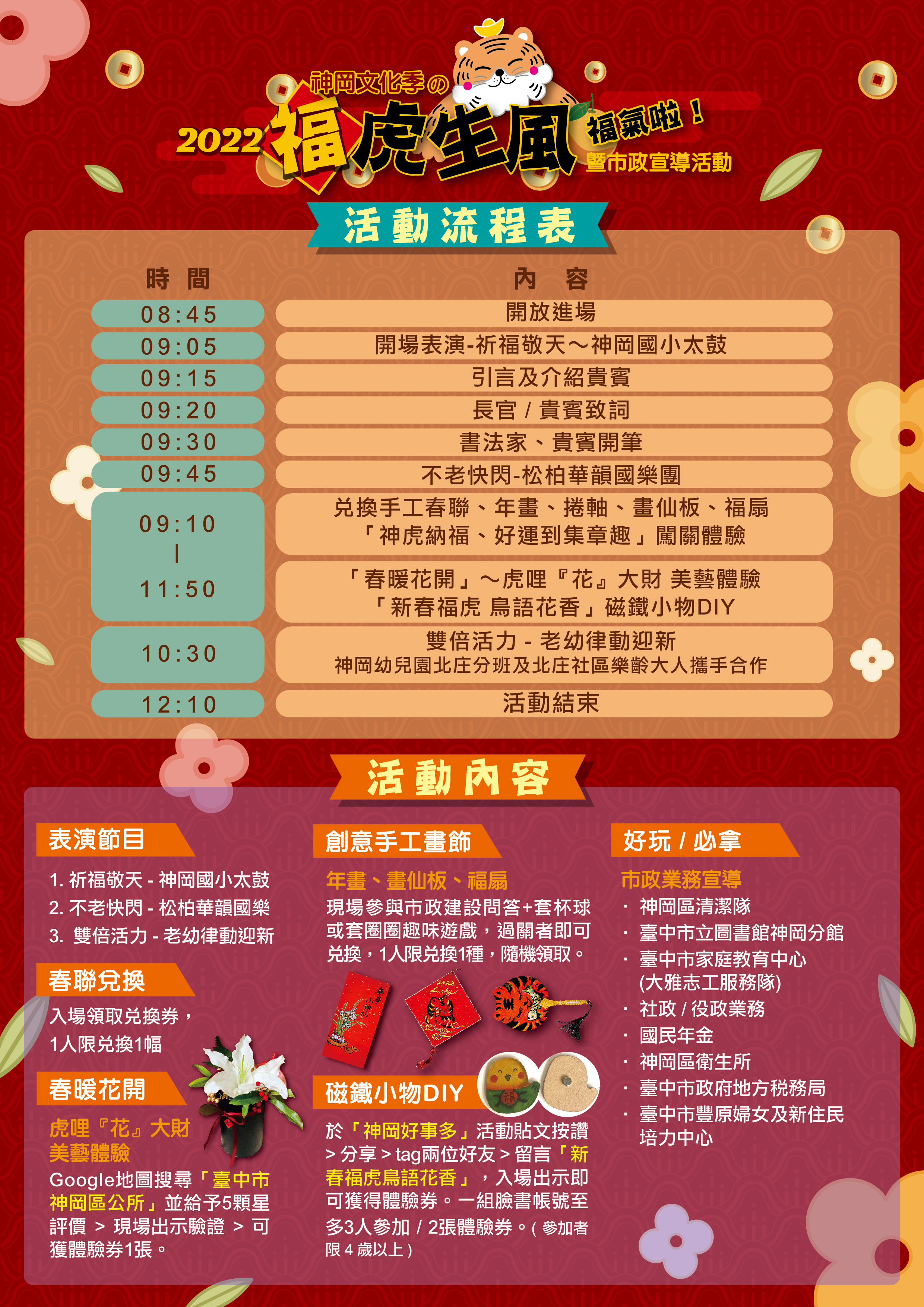 三、旨揭活動訂於 111 年 1 月 22 日(六) 8 時 45 分至 12 時 10 分,在臺中市神岡區公所前廣場(神岡區神岡路 30 號)舉辦,活動內容略述如下: