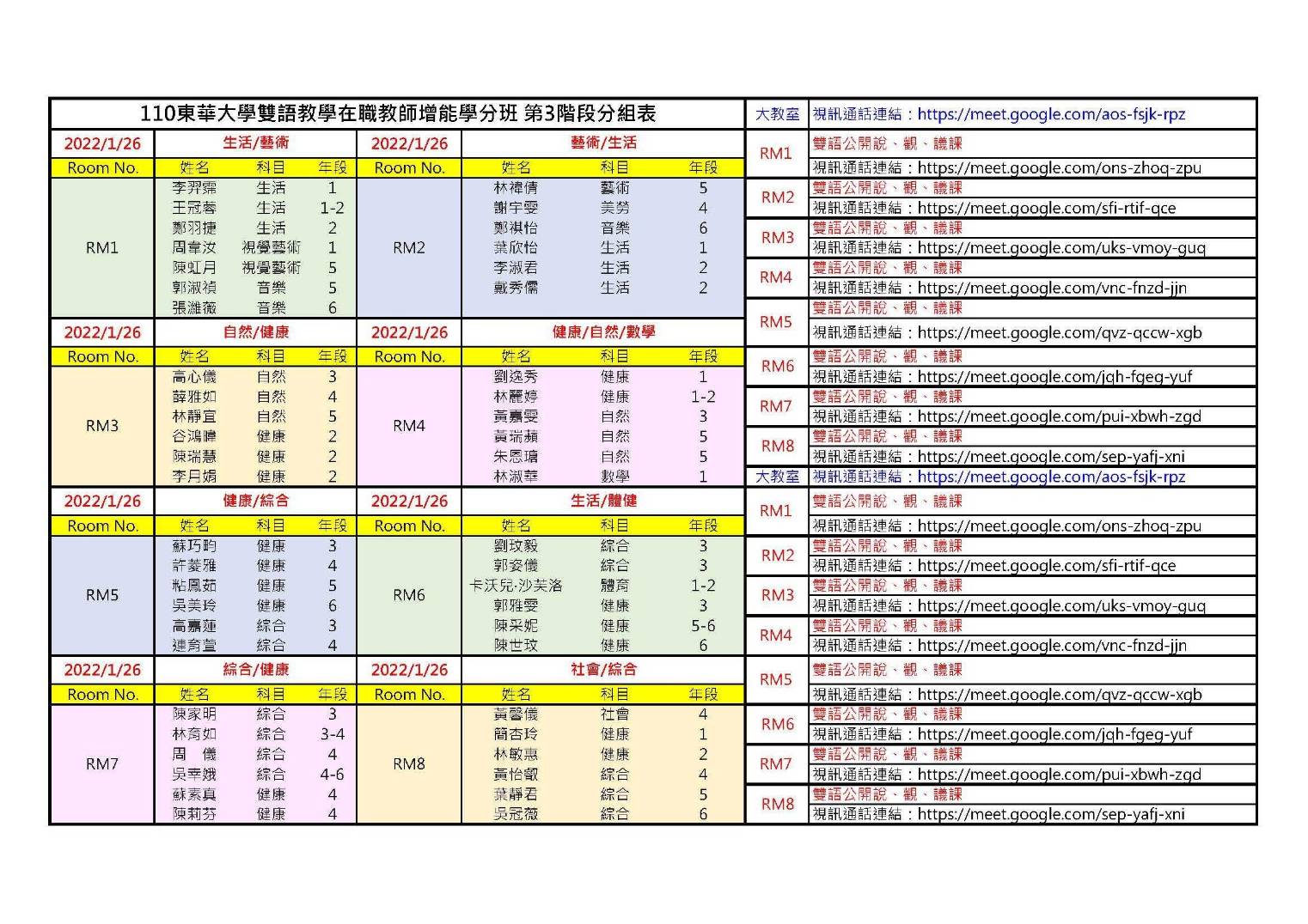 【重要通知】國立東華大學110學年寒假辦理「國小雙語教學在職增能學分 班」第三階段課程表,惠請同意貴屬教師公假進修(附參 與教師名冊),請查照。