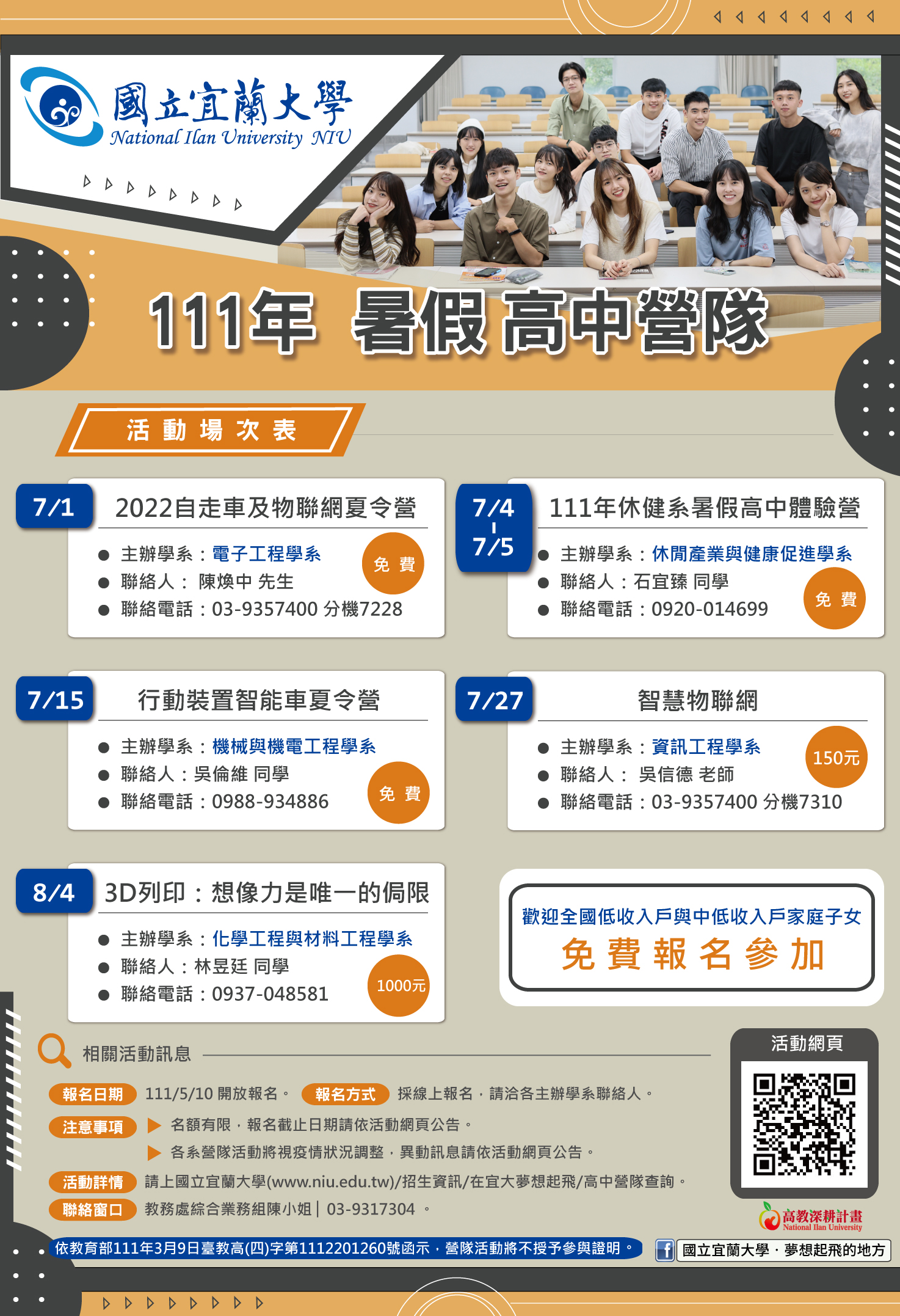 https://sites.google.com/ems.niu.edu.tw/niu-camp111summer),或由國立宜蘭大學首頁(網址:https://www.niu.edu.tw)/招生資訊/在宜大夢想起飛/高中營隊查詢。