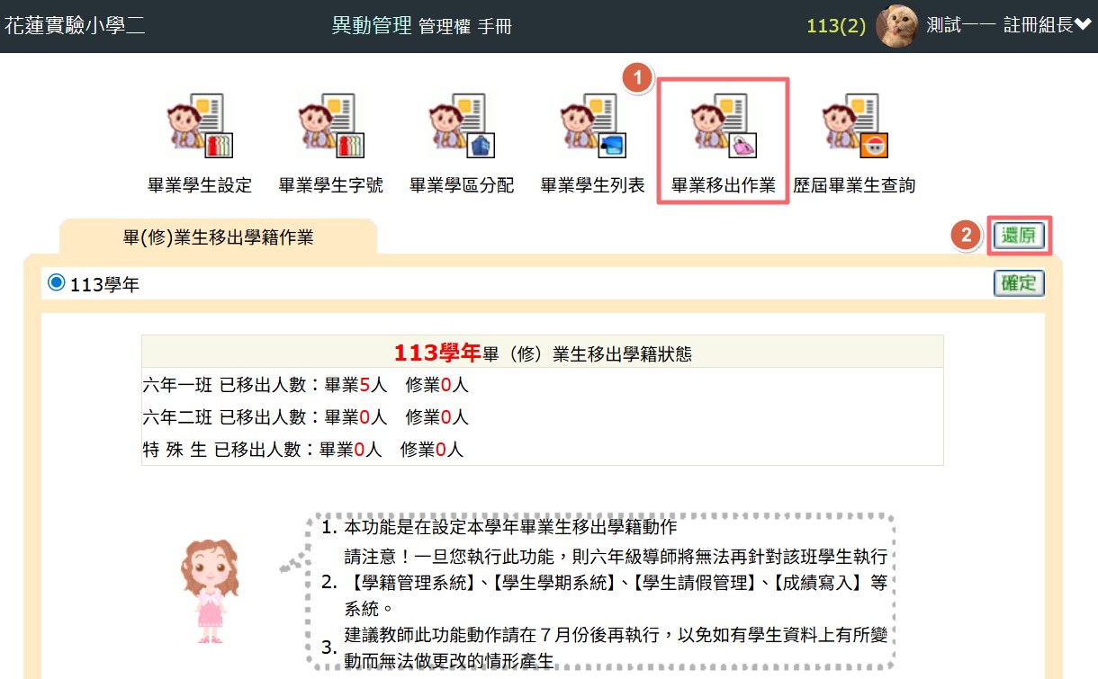 - 如學校已經完成畢業移出作業,請參考附件檔案說明於校務系統中選擇還原作業即可。