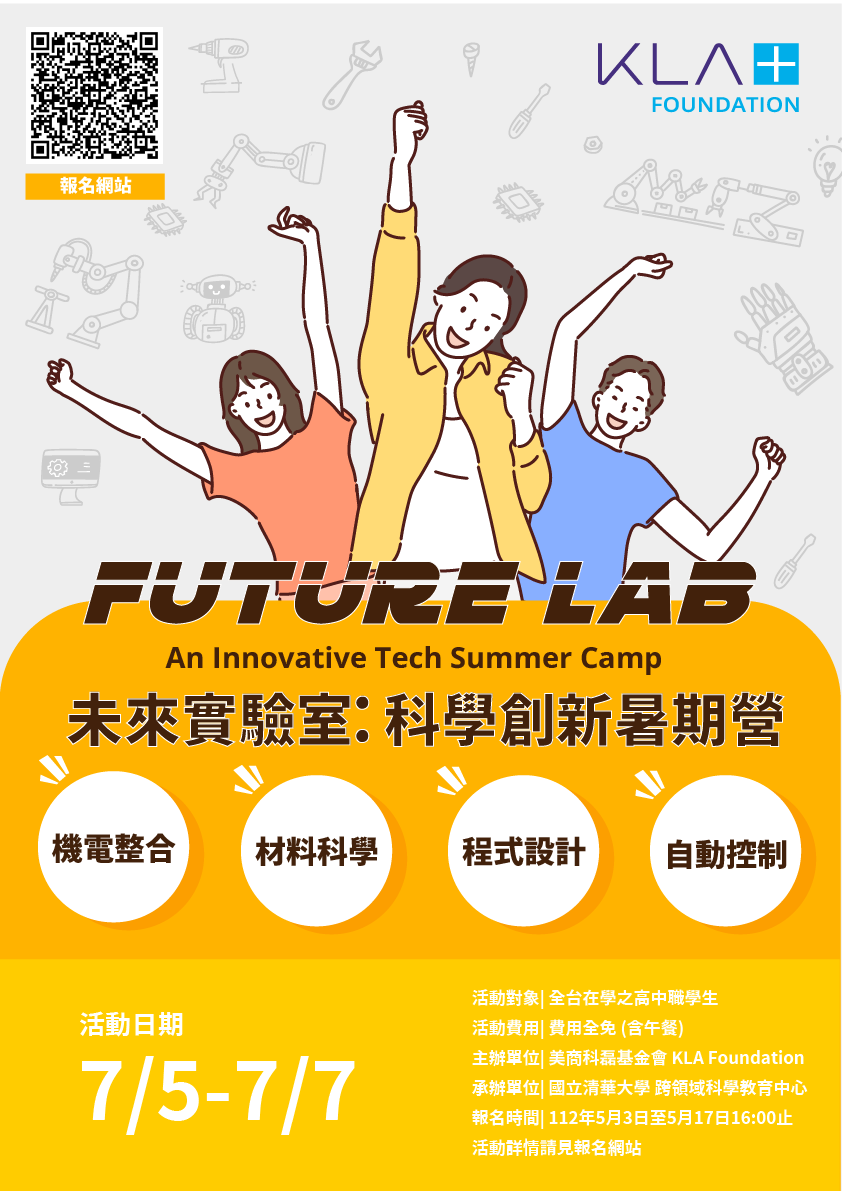 公告:國立清華大學教務處跨領域科學教育中心與美商科磊股份有限公司台灣分公司共同規劃辦理「2023年Future Lab: An Innovative Tech Summer Camp未來實驗室:科學創新暑期營」活動,供各校參閱。