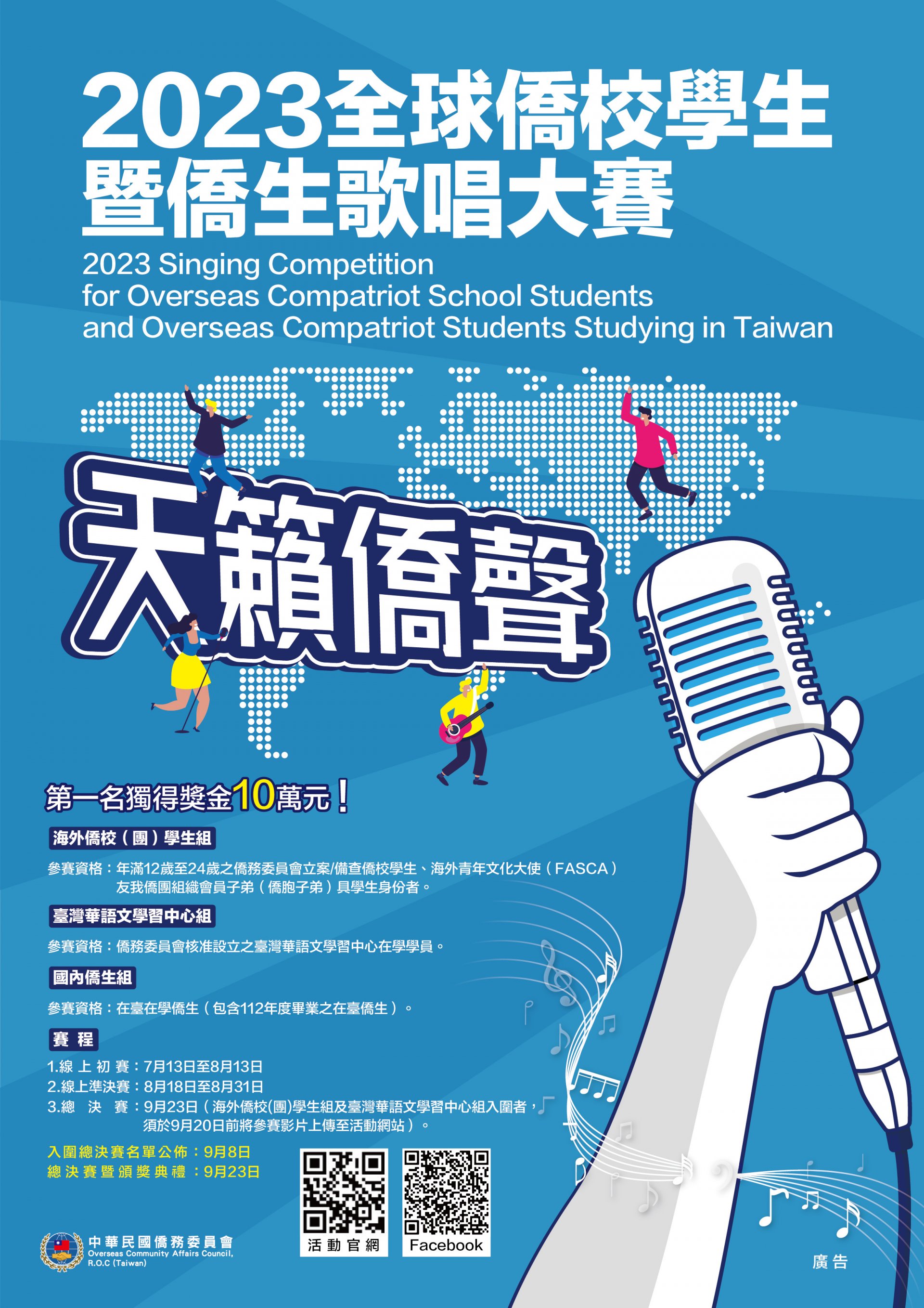 4. 線上初賽預計於7月13日正式開賽,參賽流程詳附件「網站操作說明」,請有意報名學生自即日起至報名網站(https://singocac.tw)註冊,註冊後自7月13日起可利用同網站開始進行線上初賽。倘參賽者有相關疑問,可洽客服電子郵件信箱:Sing.official@dwave.cc。另本活動設有臉書粉絲專頁(https://www.facebook.com/SingOCAC),請提供僑生踴躍按讚分享。
