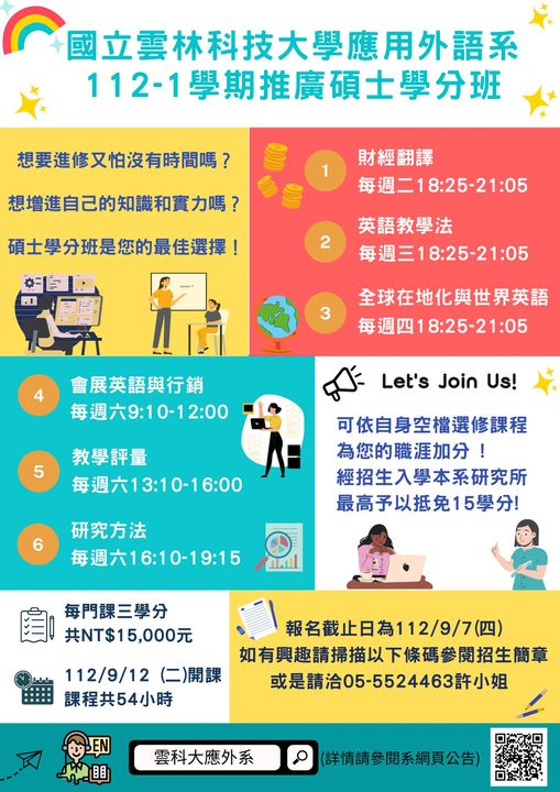 國立雲林科技大學-應用外語系推廣碩士學分班招生,請踴躍報名參加。