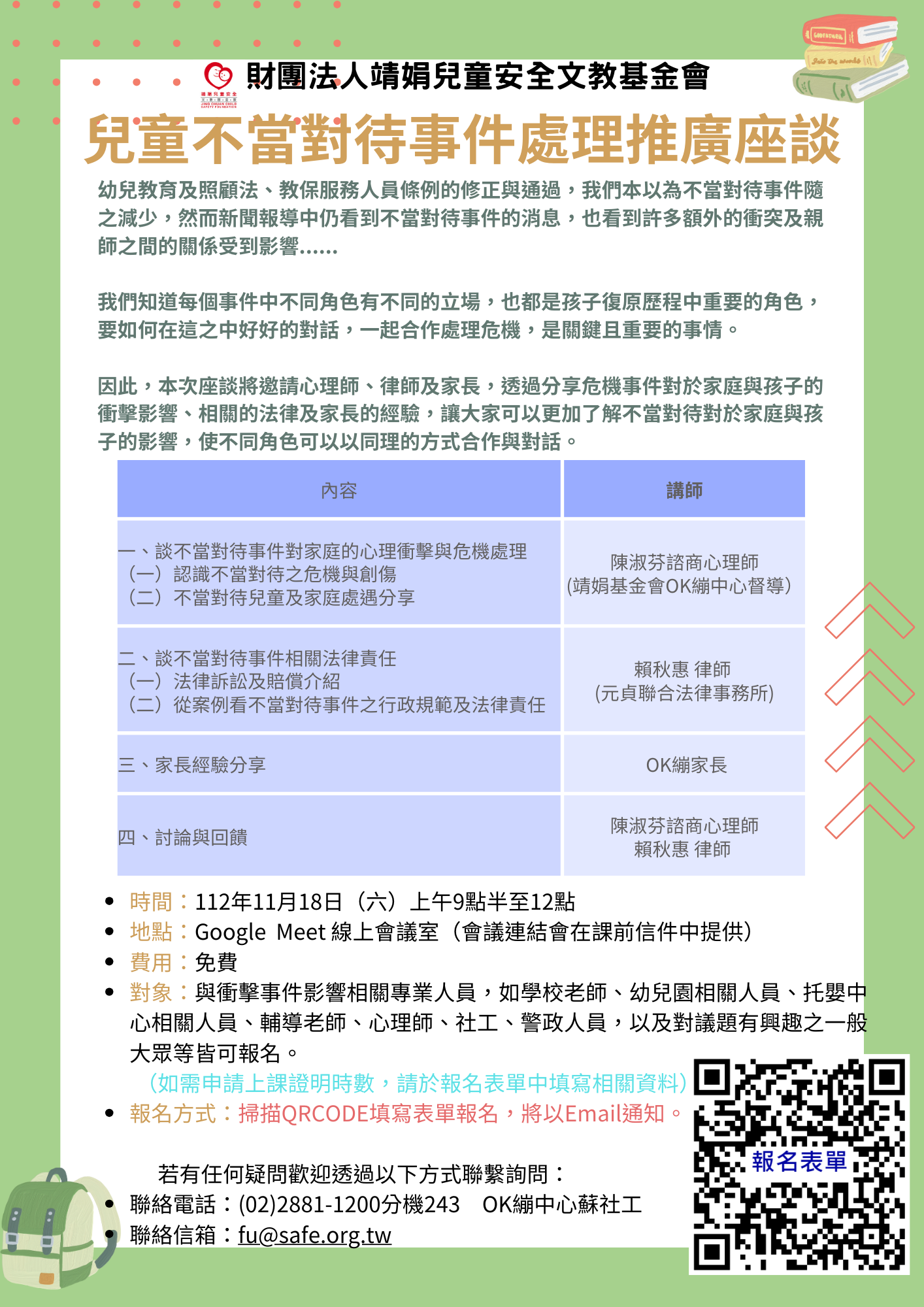檢附「112 年兒童不當對待事件處理推廣座談」宣傳單張乙份。 |