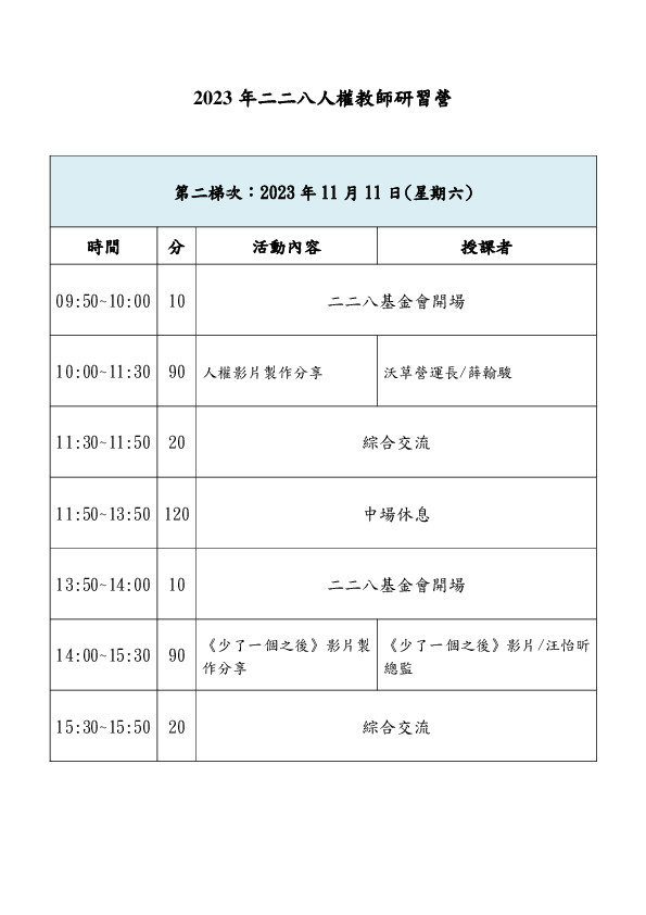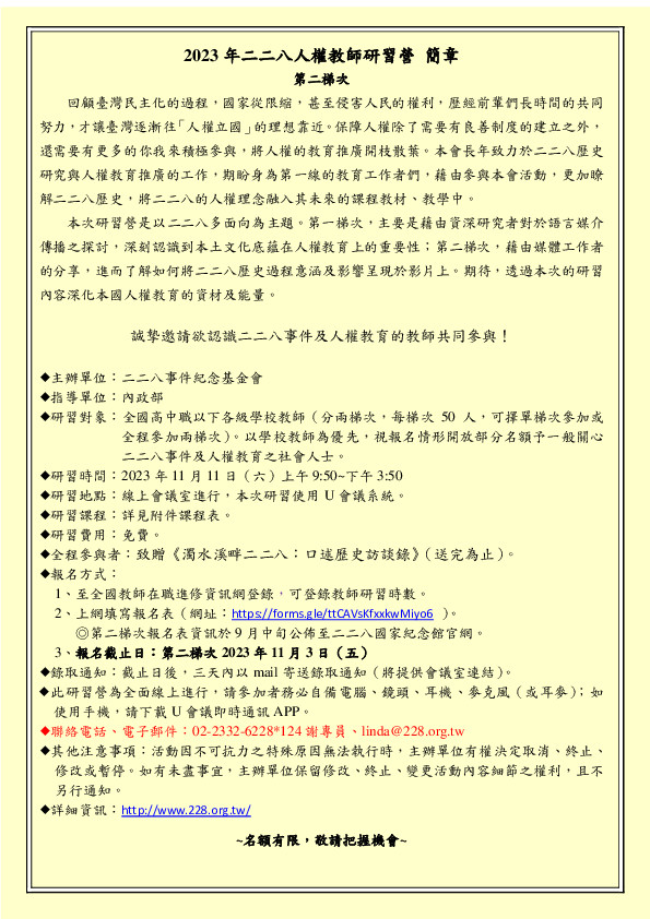 二、承上述,本會已於 112 年 5 月 27 日(星期六)辦理第一梯次「2023 年二二八人權教師研習營」活動,將賡續於同年 11 月 11 日(星期六)辦理旨揭研習營活動。為吸引更多外縣市教師一同參與,本次將全面實施線上遠距研習。鼓勵所屬高中職(含)以下各級學校教師參與。