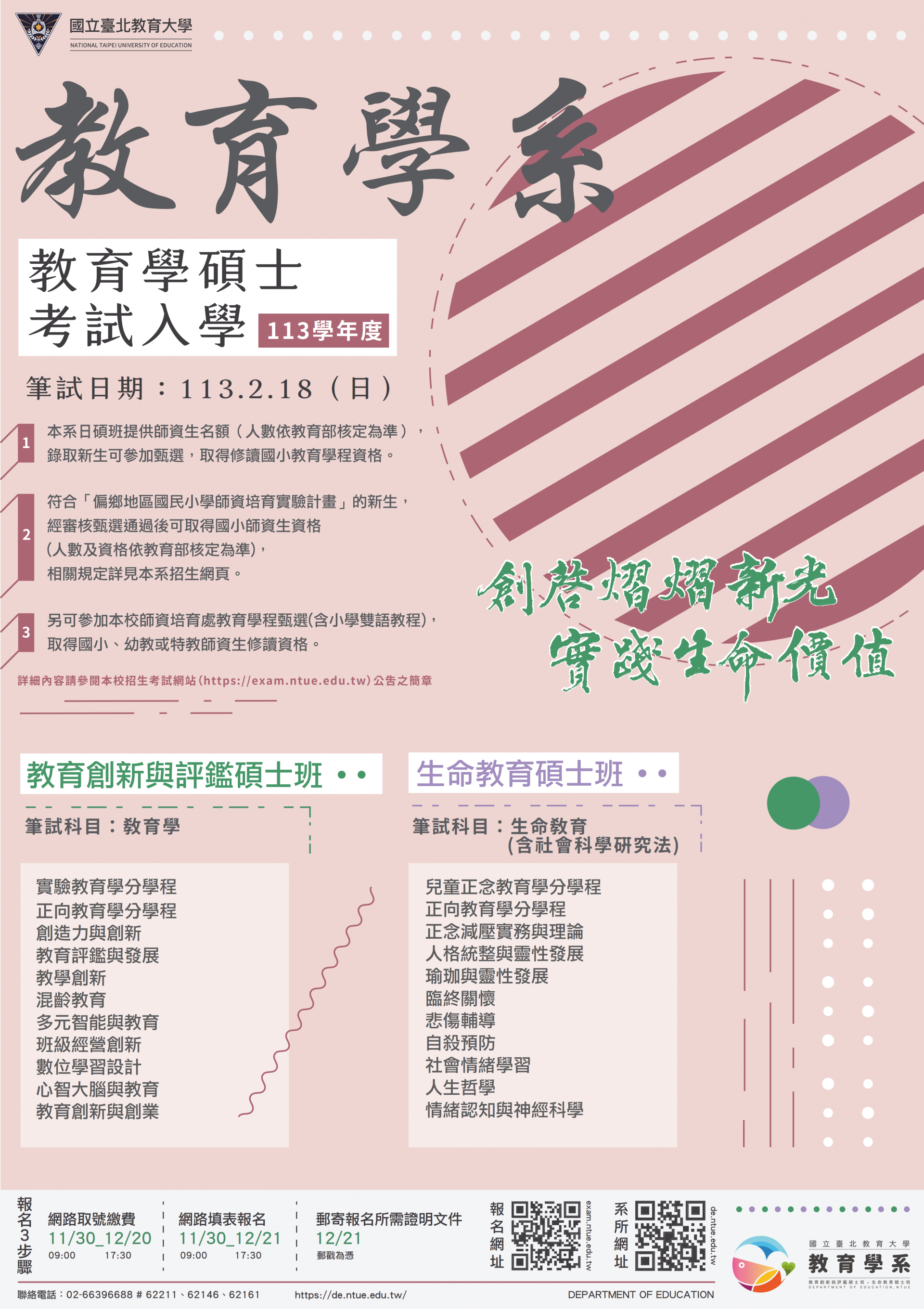 轉知國立臺北教育大學育學系「教育創新與評鑑碩士班」、「生命教育碩士班」113學年度考試入學招生相關資訊,請踴躍報考。