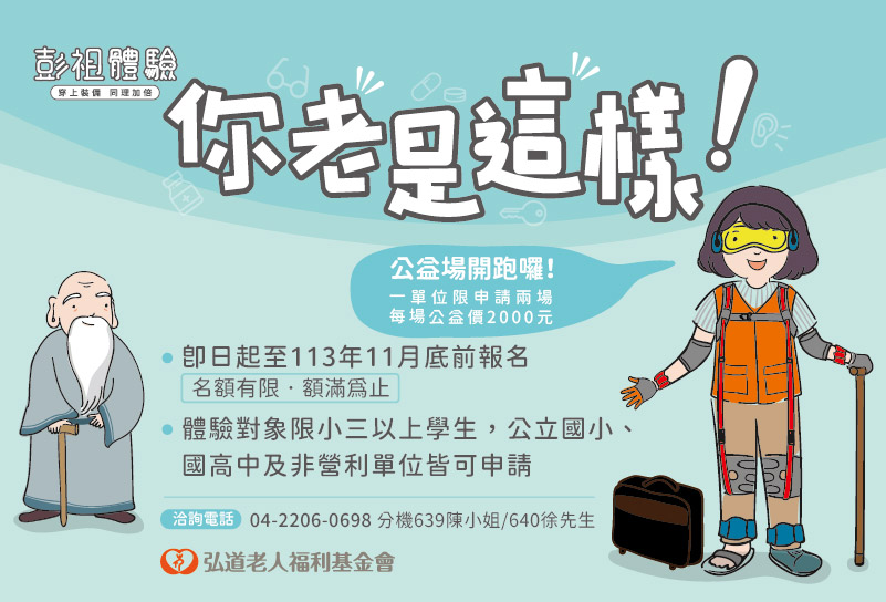 二、財團法人弘道老人福利基金會常年推動弘揚孝道,將「彭祖體驗」帶進校園讓孝道從小扎根, 113 年度受衛福部公益彩券回饋金支持,擬於各縣市辦理公益課程 60 場,希望透過穿戴老化模擬器材,讓學童了解高齡者的身體退化感受並傳遞友善長者觀念。
