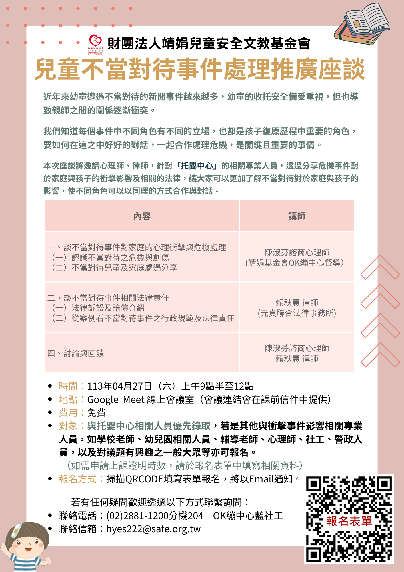 財團法人靖娟兒童安全文教基金會OK繃兒童服務中心於113年4月27日辦理「兒童不當對待事件處理推廣座談」,懇請 貴單位協助轉知,詳如說明,敬請 查照。
