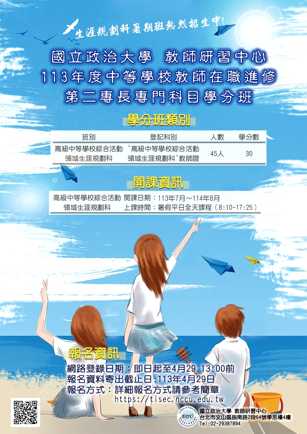 國立政治大學教育學院教師研習中心辦理「113年度中等學校教師在職進修第二專長專門科目學分班」訊息,請踴躍報名。
