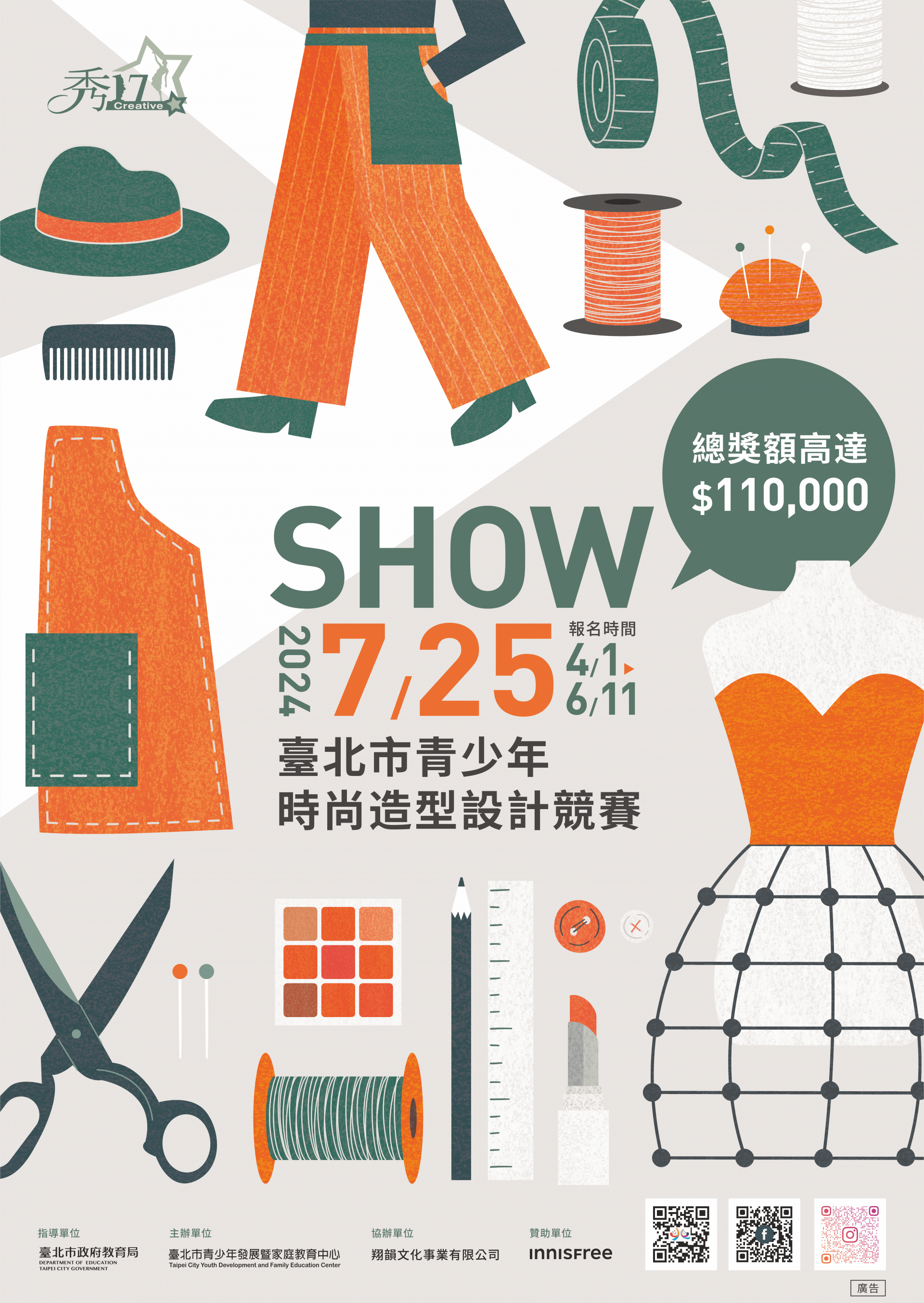 臺北市青少年發展暨家庭教育中心辦理「2024秀17-臺北市青少年時尚造型設計競 賽」,請本縣國、高中職學校鼓勵學生踴躍參加,請查照。